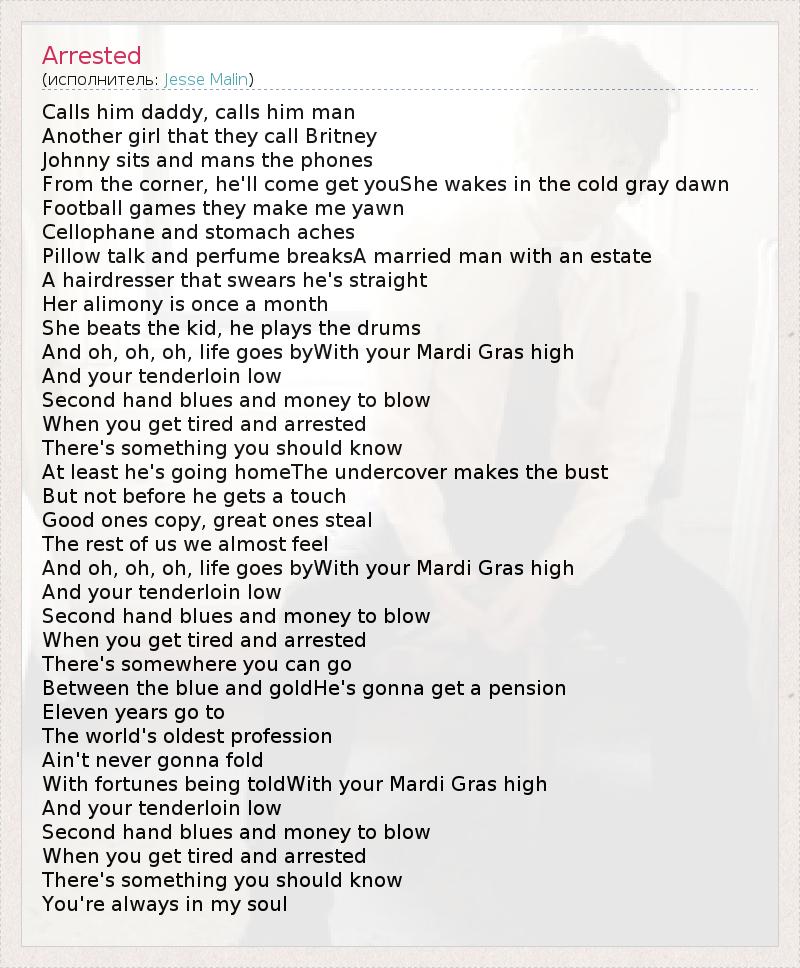Calls him daddy, calls him man Another girl that they call Britney Johnny sits and mans the phones From the corner, he'll come get youShe wakes in the cold gray dawn Football games they make me yawn Cellophane and stomach aches Pillow talk and perfume breaksA married man with an estate A hairdresser that swears he's straight Her alimony is once a month She beats the kid, he plays the drums And oh, oh, oh, life goes byWith your Mardi Gras high And your tenderloin low Second hand blues and money to blow When you get tired and arrested There's something you should know At least he's going homeThe undercover makes the bust But not before he gets a touch Good ones copy, great ones steal The rest of us we almost feel And oh, oh, oh, life goes byWith your Mardi Gras high And your tenderloin low Second hand blues and money to blow When you get tired and arrested There's somewhere you can go Between the blue and goldHe's gonna get a pension Eleven years go to The world's oldest profession Ain't never gonna fold With fortunes being toldWith your Mardi Gras high And your tenderloin low Second hand blues and money to blow When you get tired and arrested There's something you should know You're always in my soul