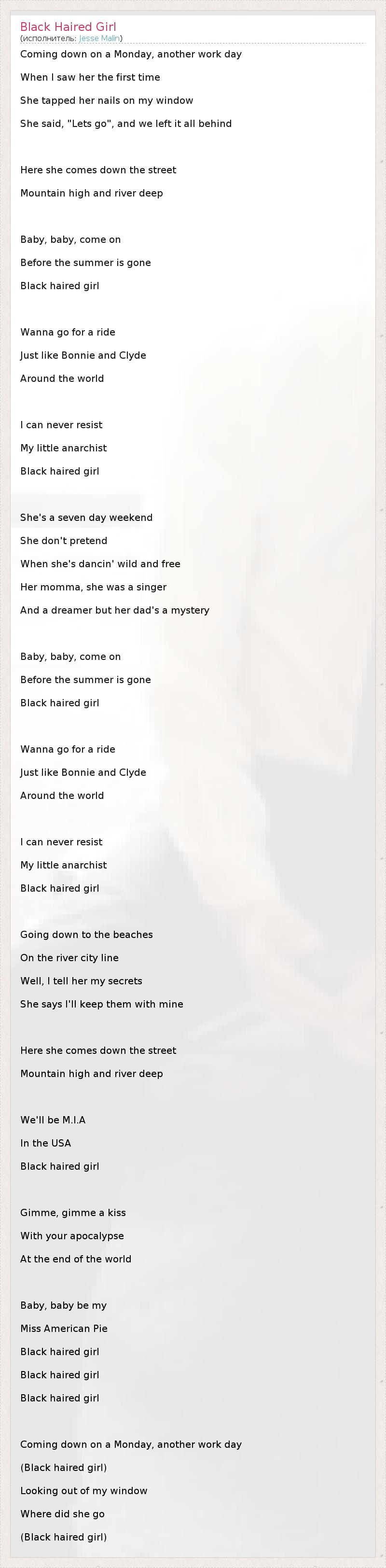 Coming down on a Monday, another work day When I saw her the first time She tapped her nails on my window She said, "Lets go", and we left it all behind Here she comes down the street Mountain high and river deep Baby, baby, come on Before the summer is gone Black haired girl Wanna go for a ride Just like Bonnie and Clyde Around the world I can never resist My little anarchist Black haired girl She's a seven day weekend She don't pretend When she's dancin' wild and free Her momma, she was a singer And a dreamer but her dad's a mystery Baby, baby, come on Before the summer is gone Black haired girl Wanna go for a ride Just like Bonnie and Clyde Around the world I can never resist My little anarchist Black haired girl Going down to the beaches On the river city line Well, I tell her my secrets She says I'll keep them with mine Here she comes down the street Mountain high and river deep We'll be M.I.A In the USA Black haired girl Gimme, gimme a kiss With your apocalypse At the end of the world Baby, baby be my Miss American Pie Black haired girl Black haired girl Black haired girl Coming down on a Monday, another work day (Black haired girl) Looking out of my window Where did she go (Black haired girl)