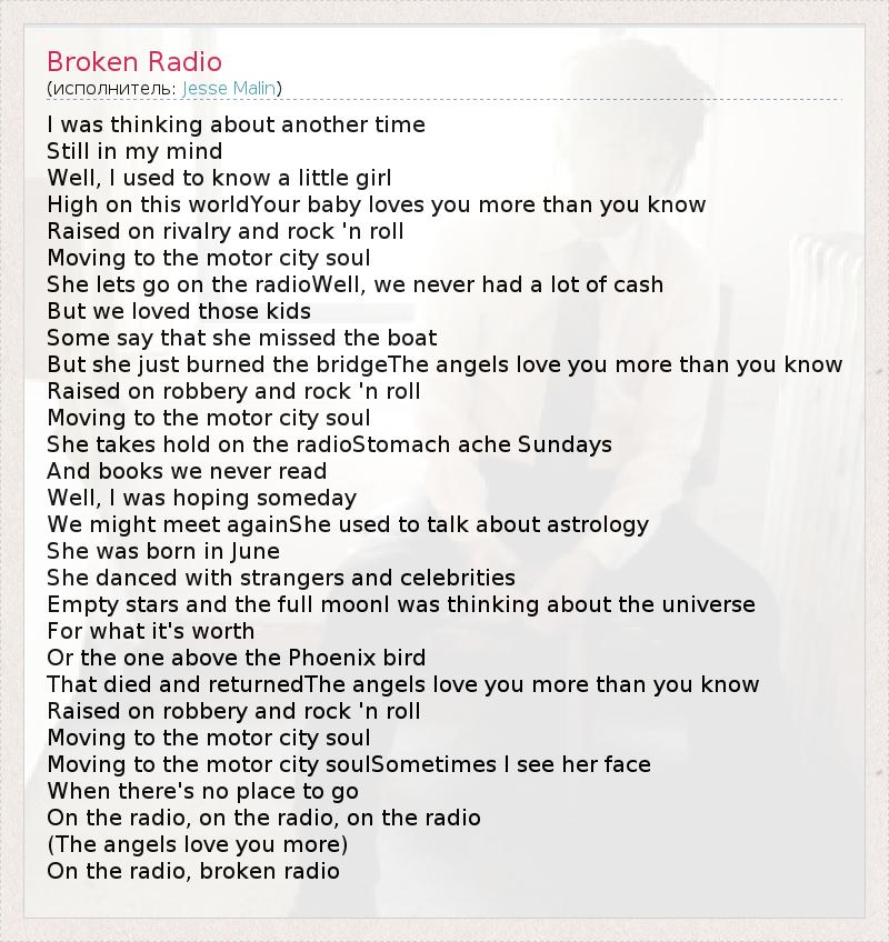 I was thinking about another time Still in my mind Well, I used to know a little girl High on this worldYour baby loves you more than you know Raised on rivalry and rock 'n roll Moving to the motor city soul She lets go on the radioWell, we never had a lot of cash But we loved those kids Some say that she missed the boat But she just burned the bridgeThe angels love you more than you know Raised on robbery and rock 'n roll Moving to the motor city soul She takes hold on the radioStomach ache Sundays And books we never read Well, I was hoping someday We might meet againShe used to talk about astrology She was born in June She danced with strangers and celebrities Empty stars and the full moonI was thinking about the universe For what it's worth Or the one above the Phoenix bird That died and returnedThe angels love you more than you know Raised on robbery and rock 'n roll Moving to the motor city soul Moving to the motor city soulSometimes I see her face When there's no place to go On the radio, on the radio, on the radio (The angels love you more) On the radio, broken radio