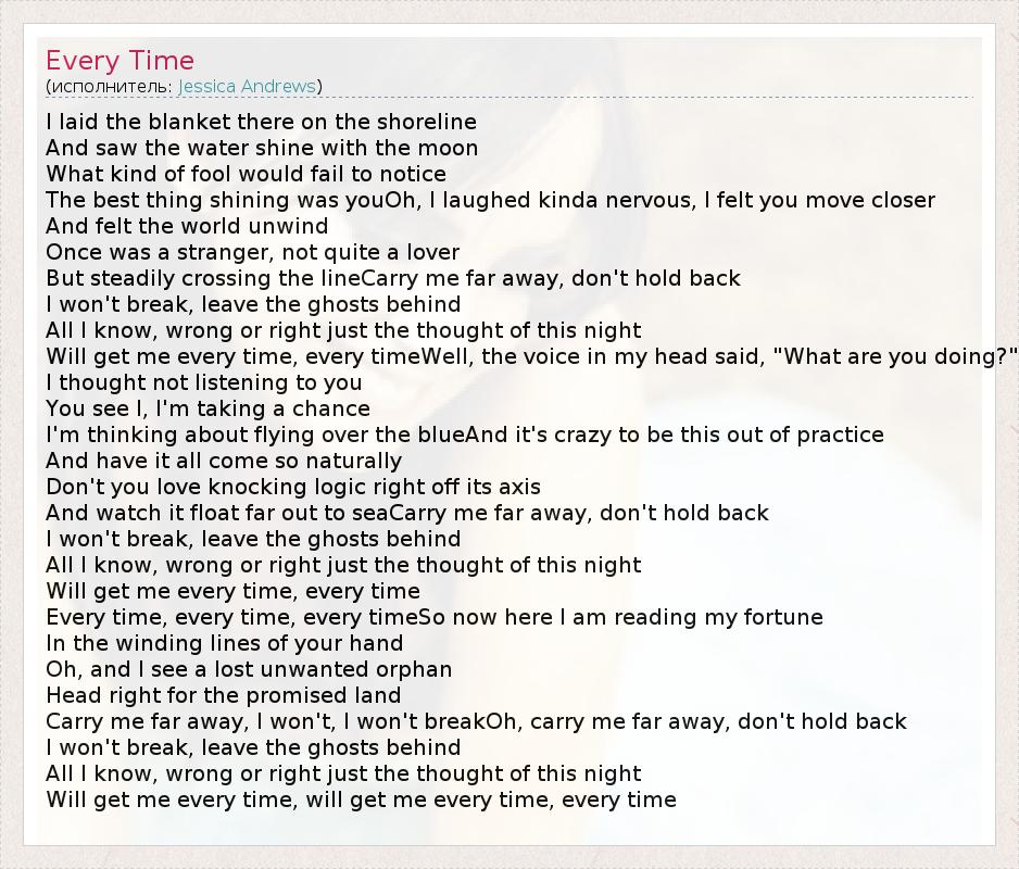 I laid the blanket there on the shoreline And saw the water shine with the moon What kind of fool would fail to notice The best thing shining was youOh, I laughed kinda nervous, I felt you move closer And felt the world unwind Once was a stranger, not quite a lover But steadily crossing the lineCarry me far away, don't hold back I won't break, leave the ghosts behind All I know, wrong or right just the thought of this night Will get me every time, every timeWell, the voice in my head said, "What are you doing?" I thought not listening to you You see I, I'm taking a chance I'm thinking about flying over the blueAnd it's crazy to be this out of practice And have it all come so naturally Don't you love knocking logic right off its axis And watch it float far out to seaCarry me far away, don't hold back I won't break, leave the ghosts behind All I know, wrong or right just the thought of this night Will get me every time, every time Every time, every time, every timeSo now here I am reading my fortune In the winding lines of your hand Oh, and I see a lost unwanted orphan Head right for the promised land Carry me far away, I won't, I won't breakOh, carry me far away, don't hold back I won't break, leave the ghosts behind All I know, wrong or right just the thought of this night Will get me every time, will get me every time, every time