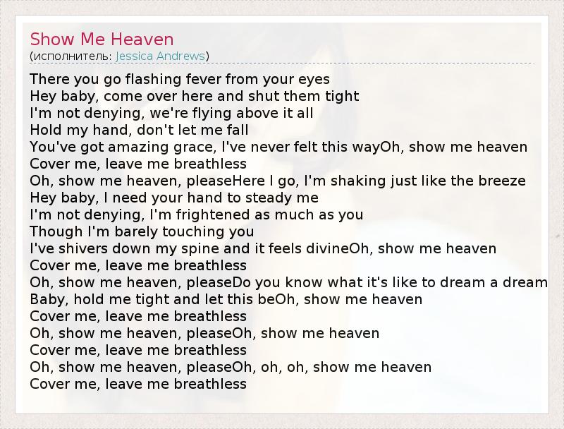 There you go flashing fever from your eyes Hey baby, come over here and shut them tight I'm not denying, we're flying above it all Hold my hand, don't let me fall You've got amazing grace, I've never felt this wayOh, show me heaven Cover me, leave me breathless Oh, show me heaven, pleaseHere I go, I'm shaking just like the breeze Hey baby, I need your hand to steady me I'm not denying, I'm frightened as much as you Though I'm barely touching you I've shivers down my spine and it feels divineOh, show me heaven Cover me, leave me breathless Oh, show me heaven, pleaseDo you know what it's like to dream a dream Baby, hold me tight and let this beOh, show me heaven Cover me, leave me breathless Oh, show me heaven, pleaseOh, show me heaven Cover me, leave me breathless Oh, show me heaven, pleaseOh, oh, oh, show me heaven Cover me, leave me breathless