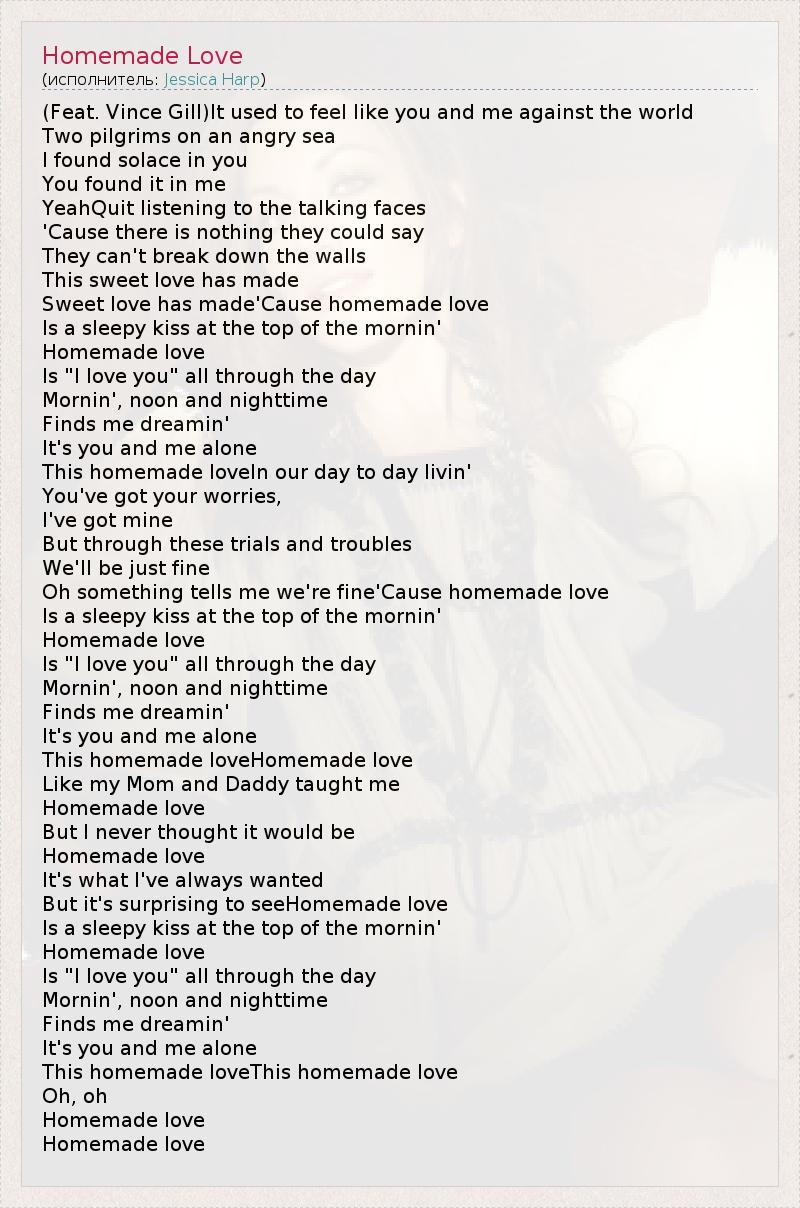 (Feat. Vince Gill)It used to feel like you and me against the world Two pilgrims on an angry sea I found solace in you You found it in me YeahQuit listening to the talking faces 'Cause there is nothing they could say They can't break down the walls This sweet love has made Sweet love has made'Cause homemade love Is a sleepy kiss at the top of the mornin' Homemade love Is "I love you" all through the day Mornin', noon and nighttime Finds me dreamin' It's you and me alone This homemade loveIn our day to day livin' You've got your worries, I've got mine But through these trials and troubles We'll be just fine Oh something tells me we're fine'Cause homemade love Is a sleepy kiss at the top of the mornin' Homemade love Is "I love you" all through the day Mornin', noon and nighttime Finds me dreamin' It's you and me alone This homemade loveHomemade love Like my Mom and Daddy taught me Homemade love But I never thought it would be Homemade love It's what I've always wanted But it's surprising to seeHomemade love Is a sleepy kiss at the top of the mornin' Homemade love Is "I love you" all through the day Mornin', noon and nighttime Finds me dreamin' It's you and me alone This homemade loveThis homemade love Oh, oh Homemade love Homemade love
