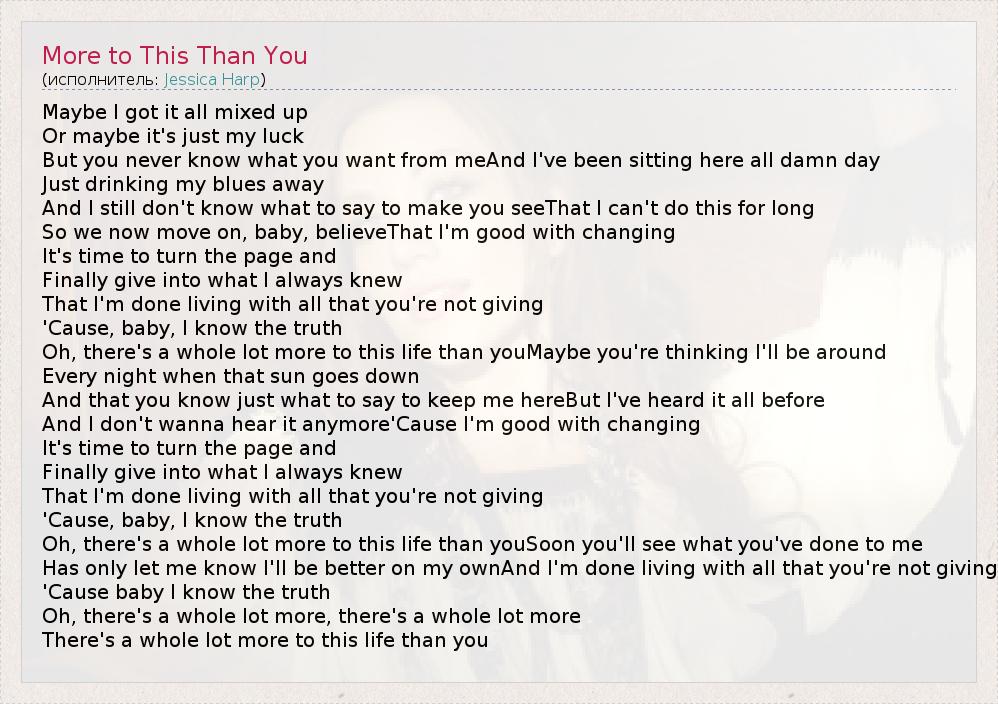 Maybe I got it all mixed up Or maybe it's just my luck But you never know what you want from meAnd I've been sitting here all damn day Just drinking my blues away And I still don't know what to say to make you seeThat I can't do this for long So we now move on, baby, believeThat I'm good with changing It's time to turn the page and Finally give into what I always knew That I'm done living with all that you're not giving 'Cause, baby, I know the truth Oh, there's a whole lot more to this life than youMaybe you're thinking I'll be around Every night when that sun goes down And that you know just what to say to keep me hereBut I've heard it all before And I don't wanna hear it anymore'Cause I'm good with changing It's time to turn the page and Finally give into what I always knew That I'm done living with all that you're not giving 'Cause, baby, I know the truth Oh, there's a whole lot more to this life than youSoon you'll see what you've done to me Has only let me know I'll be better on my ownAnd I'm done living with all that you're not giving 'Cause baby I know the truth Oh, there's a whole lot more, there's a whole lot more There's a whole lot more to this life than you