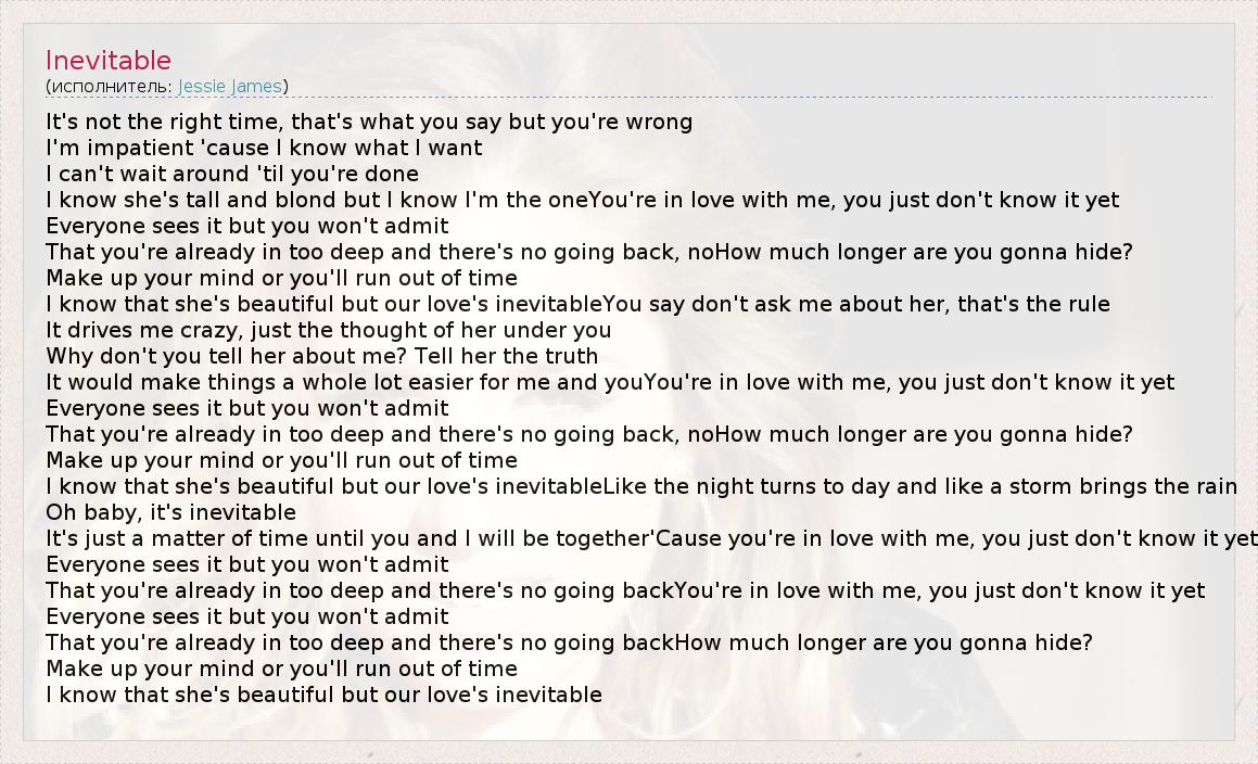 I know that she's beautiful but our love's inevitableYou say don't ask me about her, that's the rule