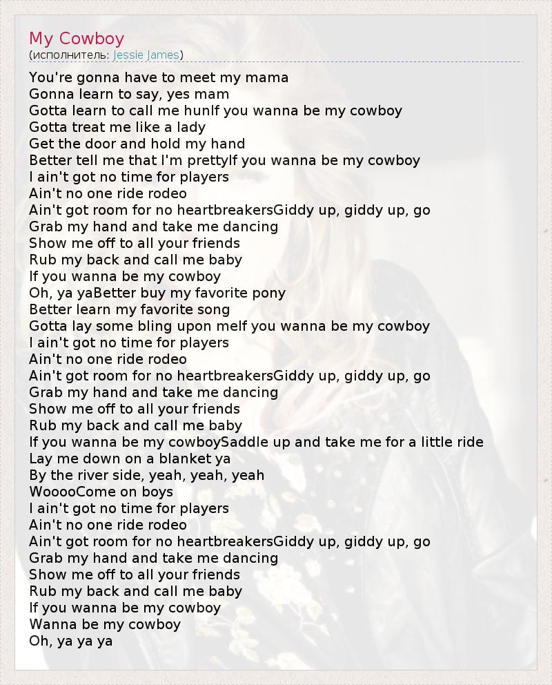 You're gonna have to meet my mama Gonna learn to say, yes mam Gotta learn to call me hunIf you wanna be my cowboy Gotta treat me like a lady Get the door and hold my hand Better tell me that I'm prettyIf you wanna be my cowboy I ain't got no time for players Ain't no one ride rodeo Ain't got room for no heartbreakersGiddy up, giddy up, go Grab my hand and take me dancing Show me off to all your friends Rub my back and call me baby If you wanna be my cowboy Oh, ya yaBetter buy my favorite pony Better learn my favorite song Gotta lay some bling upon meIf you wanna be my cowboy I ain't got no time for players Ain't no one ride rodeo Ain't got room for no heartbreakersGiddy up, giddy up, go Grab my hand and take me dancing Show me off to all your friends Rub my back and call me baby If you wanna be my cowboySaddle up and take me for a little ride Lay me down on a blanket ya By the river side, yeah, yeah, yeah WooooCome on boys I ain't got no time for players Ain't no one ride rodeo Ain't got room for no heartbreakersGiddy up, giddy up, go Grab my hand and take me dancing Show me off to all your friends Rub my back and call me baby If you wanna be my cowboy Wanna be my cowboy Oh, ya ya ya