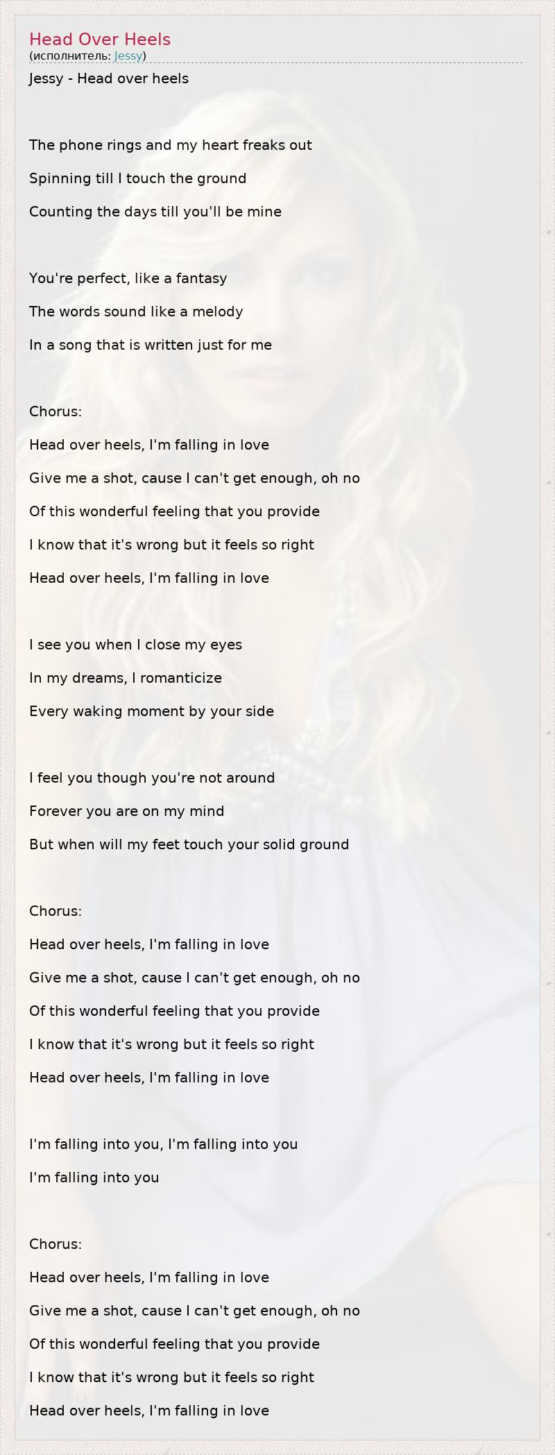 Jessy - Head over heels The phone rings and my heart freaks out Spinning till I touch the ground Counting the days till you'll be mine You're perfect, like a fantasy The words sound like a melody In a song that is written just for me Chorus: Head over heels, I'm falling in love Give me a shot, cause I can't get enough, oh no Of this wonderful feeling that you provide I know that it's wrong but it feels so right Head over heels, I'm falling in love I see you when I close my eyes In my dreams, I romanticize Every waking moment by your side I feel you though you're not around Forever you are on my mind But when will my feet touch your solid ground Chorus: Head over heels, I'm falling in love Give me a shot, cause I can't get enough, oh no Of this wonderful feeling that you provide I know that it's wrong but it feels so right Head over heels, I'm falling in love I'm falling into you, I'm falling into you I'm falling into you Chorus: Head over heels, I'm falling in love Give me a shot, cause I can't get enough, oh no Of this wonderful feeling that you provide I know that it's wrong but it feels so right Head over heels, I'm falling in love