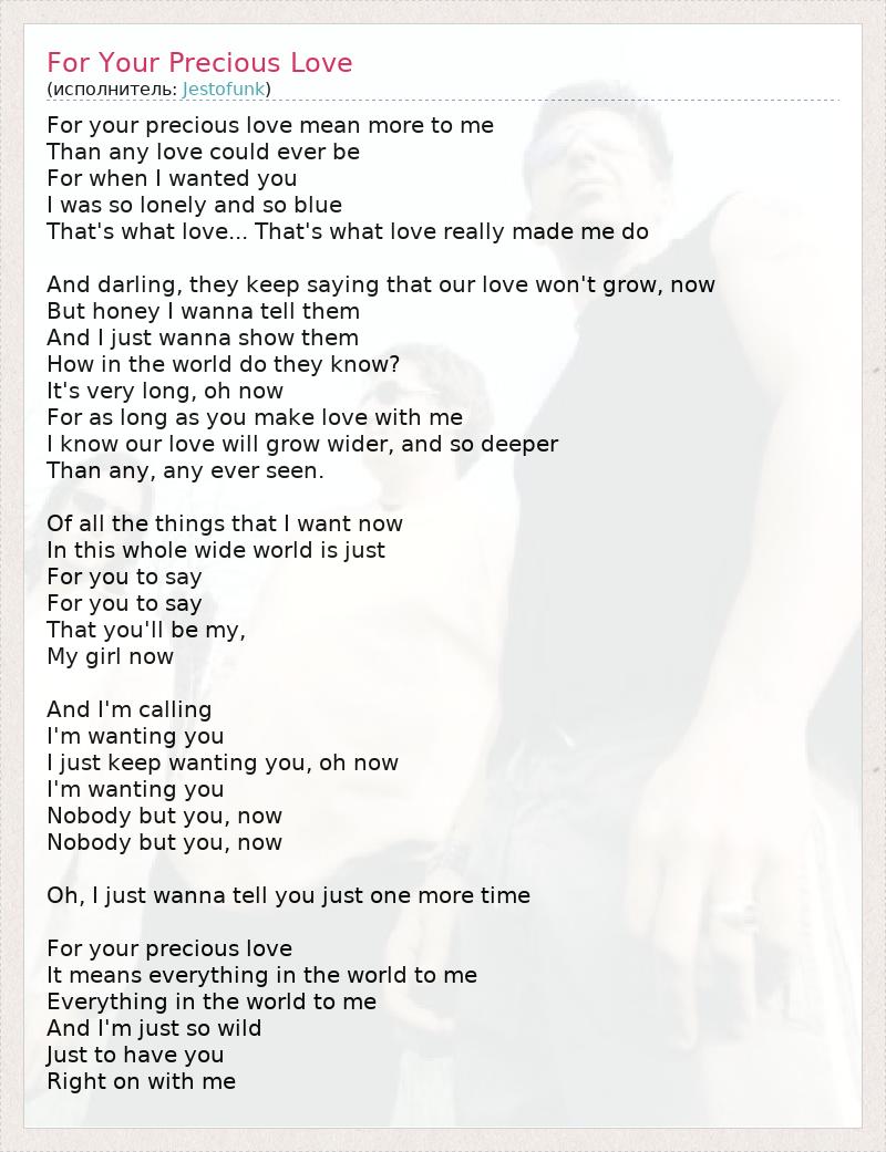 For your precious love mean more to me Than any love could ever be For when I wanted you I was so lonely and so blue That's what love... That's what love really made me do And darling, they keep saying that our love won't grow, now But honey I wanna tell them And I just wanna show them How in the world do they know? It's very long, oh now For as long as you make love with me I know our love will grow wider, and so deeper Than any, any ever seen. Of all the things that I want now In this whole wide world is just For you to say For you to say That you'll be my, My girl now And I'm calling I'm wanting you I just keep wanting you, oh now I'm wanting you Nobody but you, now Nobody but you, now Oh, I just wanna tell you just one more time For your precious love It means everything in the world to me Everything in the world to me And I'm just so wild Just to have you Right on with me
