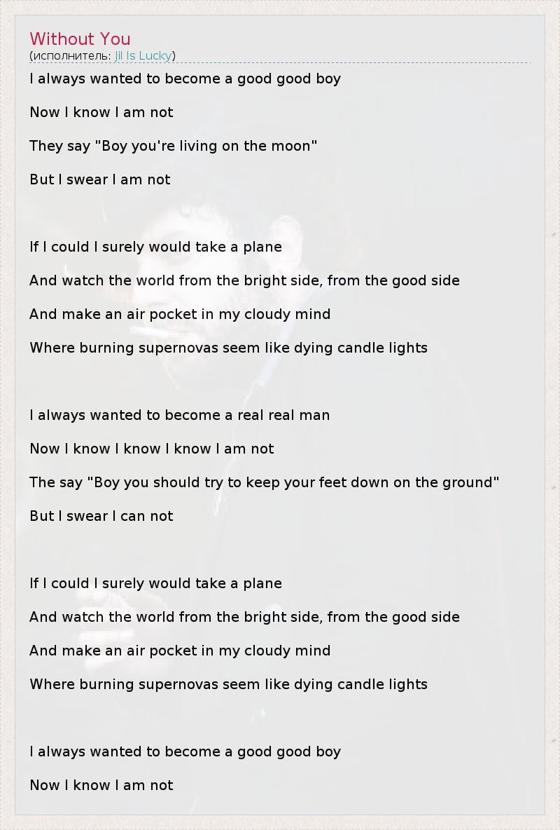 I always wanted to become a good good boy Now I know I am not They say "Boy you're living on the moon" But I swear I am not If I could I surely would take a plane And watch the world from the bright side, from the good side And make an air pocket in my cloudy mind Where burning supernovas seem like dying candle lights I always wanted to become a real real man Now I know I know I know I am not The say "Boy you should try to keep your feet down on the ground" But I swear I can not If I could I surely would take a plane And watch the world from the bright side, from the good side And make an air pocket in my cloudy mind Where burning supernovas seem like dying candle lights I always wanted to become a good good boy Now I know I am not