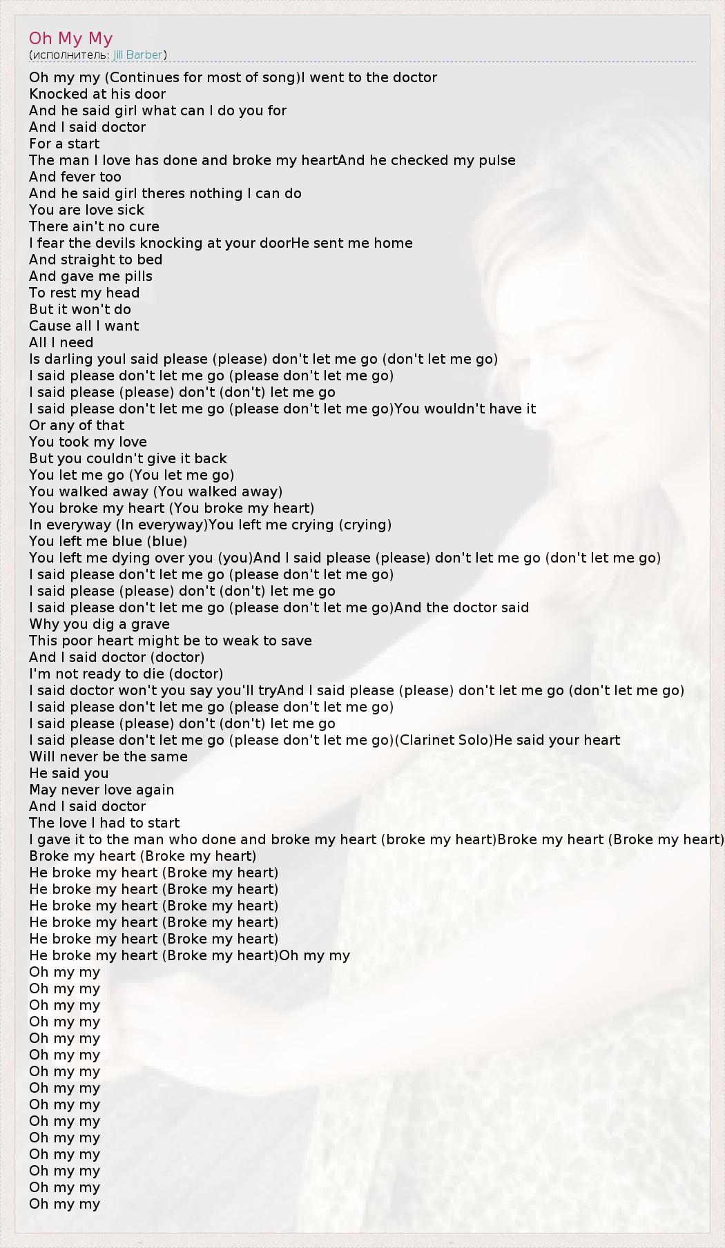 Oh my my (Continues for most of song)I went to the doctor Knocked at his door And he said girl what can I do you for And I said doctor For a start The man I love has done and broke my heartAnd he checked my pulse And fever too And he said girl theres nothing I can do You are love sick There ain't no cure I fear the devils knocking at your doorHe sent me home And straight to bed And gave me pills To rest my head But it won't do Cause all I want All I need Is darling youI said please (please) don't let me go (don't let me go) I said please don't let me go (please don't let me go) I said please (please) don't (don't) let me go I said please don't let me go (please don't let me go)You wouldn't have it Or any of that You took my love But you couldn't give it back You let me go (You let me go) You walked away (You walked away) You broke my heart (You broke my heart) In everyway (In everyway)You left me crying (crying) You left me blue (blue) You left me dying over you (you)And I said please (please) don't let me go (don't let me go) I said please don't let me go (please don't let me go) I said please (please) don't (don't) let me go I said please don't let me go (please don't let me go)And the doctor said Why you dig a grave This poor heart might be to weak to save And I said doctor (doctor) I'm not ready to die (doctor) I said doctor won't you say you'll tryAnd I said please (please) don't let me go (don't let me go) I said please don't let me go (please don't let me go) I said please (please) don't (don't) let me go I said please don't let me go (please don't let me go)(Clarinet Solo)He said your heart Will never be the same He said you May never love again And I said doctor The love I had to start I gave it to the man who done and broke my heart (broke my heart)Broke my heart (Broke my heart) Broke my heart (Broke my heart) He broke my heart (Broke my heart) He broke my heart (Broke my heart) He broke my heart (Broke my heart) He broke my heart (Broke my heart) He broke my heart (Broke my heart) He broke my heart (Broke my heart)Oh my my Oh my my Oh my my Oh my my Oh my my Oh my my Oh my my Oh my my Oh my my Oh my my Oh my my Oh my my Oh my my Oh my my Oh my my Oh my my