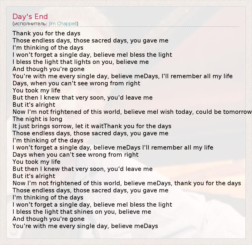 Thank you for the days Those endless days, those sacred days, you gave me I'm thinking of the days I won't forget a single day, believe meI bless the light I bless the light that lights on you, believe me And though you're gone You're with me every single day, believe meDays, I'll remember all my life Days, when you can't see wrong from right You took my life But then I knew that very soon, you'd leave me But it's alright Now I'm not frightened of this world, believe meI wish today, could be tomorrow The night is long It just brings sorrow, let it waitThank you for the days Those endless days, those sacred days, you gave me I'm thinking of the days I won't forget a single day, believe meDays I'll remember all my life Days when you can't see wrong from right You took my life But then I knew that very soon, you'd leave me But it's alright Now I'm not frightened of this world, believe meDays, thank you for the days Those endless days, those sacred days, you gave me I'm thinking of the days I won't forget a single day, believe meI bless the light I bless the light that shines on you, believe me And though you're gone You're with me every single day, believe meDays
