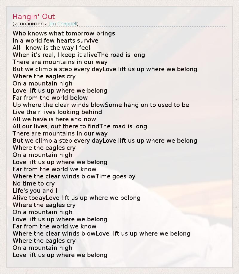 Who knows what tomorrow brings In a world few hearts survive All I know is the way I feel When it's real, I keep it aliveThe road is long There are mountains in our way But we climb a step every dayLove lift us up where we belong Where the eagles cry On a mountain high Love lift us up where we belong Far from the world below Up where the clear winds blowSome hang on to used to be Live their lives looking behind All we have is here and now All our lives, out there to findThe road is long There are mountains in our way But we climb a step every dayLove lift us up where we belong Where the eagles cry On a mountain high Love lift us up where we belong Far from the world we know Where the clear winds blowTime goes by No time to cry Life's you and I Alive todayLove lift us up where we belong Where the eagles cry On a mountain high Love lift us up where we belong Far from the world we know Where the clear winds blowLove lift us up where we belong Where the eagles cry On a mountain high Love lift us up where we belong