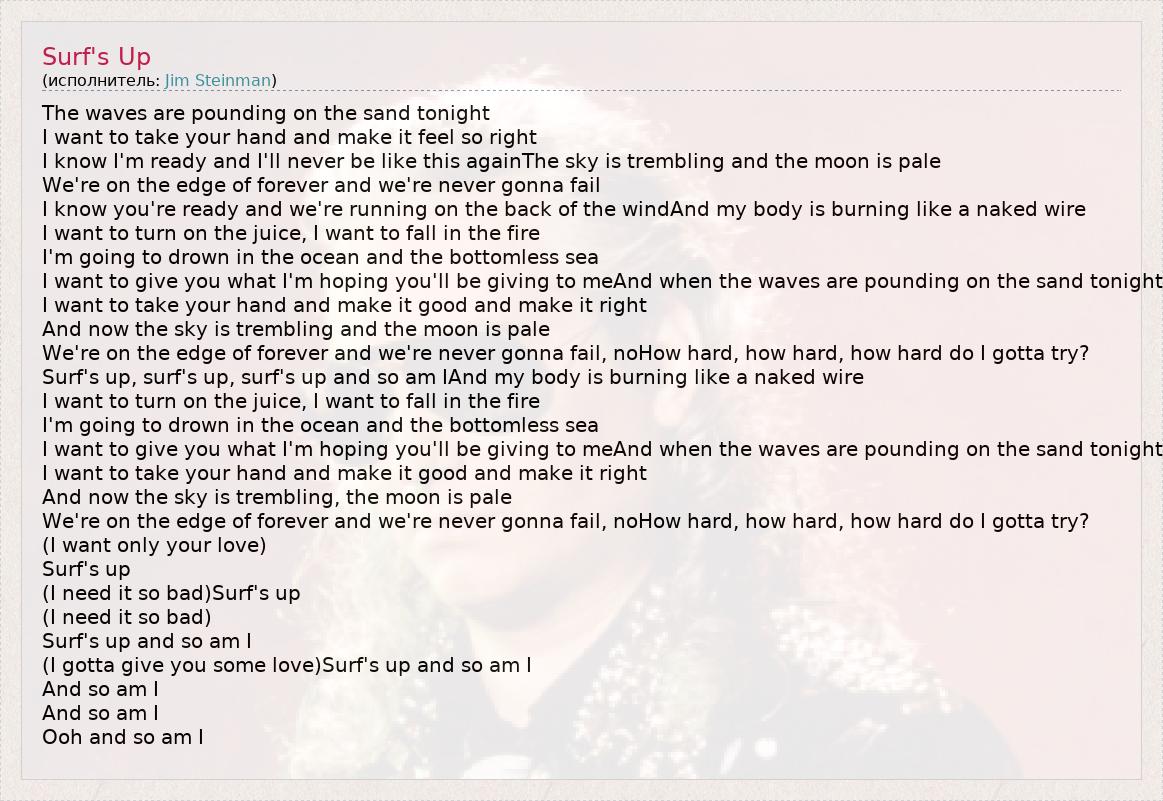 The waves are pounding on the sand tonight I want to take your hand and make it feel so right I know I'm ready and I'll never be like this againThe sky is trembling and the moon is pale We're on the edge of forever and we're never gonna fail I know you're ready and we're running on the back of the windAnd my body is burning like a naked wire I want to turn on the juice, I want to fall in the fire I'm going to drown in the ocean and the bottomless sea I want to give you what I'm hoping you'll be giving to meAnd when the waves are pounding on the sand tonight I want to take your hand and make it good and make it right And now the sky is trembling and the moon is pale We're on the edge of forever and we're never gonna fail, noHow hard, how hard, how hard do I gotta try? Surf's up, surf's up, surf's up and so am IAnd my body is burning like a naked wire I want to turn on the juice, I want to fall in the fire I'm going to drown in the ocean and the bottomless sea I want to give you what I'm hoping you'll be giving to meAnd when the waves are pounding on the sand tonight I want to take your hand and make it good and make it right And now the sky is trembling, the moon is pale We're on the edge of forever and we're never gonna fail, noHow hard, how hard, how hard do I gotta try? (I want only your love) Surf's up (I need it so bad)Surf's up (I need it so bad) Surf's up and so am I (I gotta give you some love)Surf's up and so am I And so am I And so am I Ooh and so am I