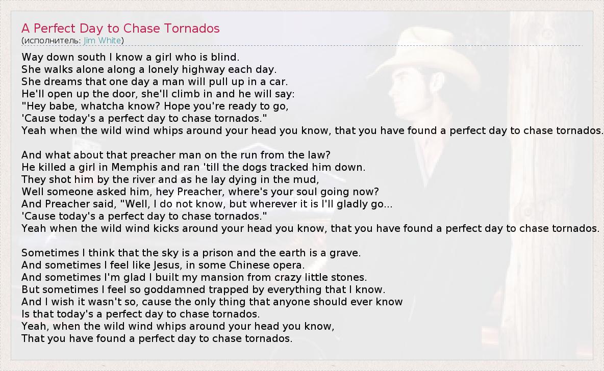 А как ты думаешь, о чем песня "A Perfect Day to Chase Tornados" ?