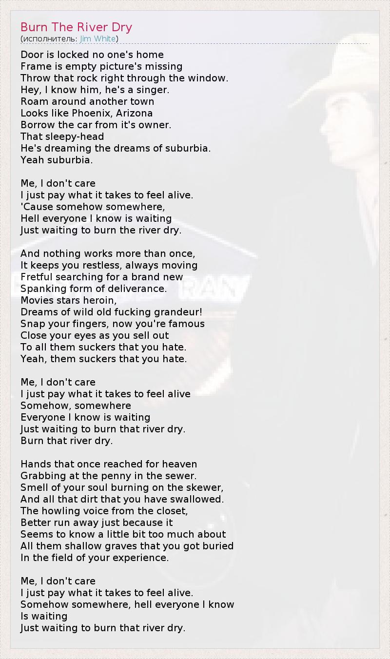 Door is locked no one's home Frame is empty picture's missing Throw that rock right through the window. Hey, I know him, he's a singer. Roam around another town Looks like Phoenix, Arizona Borrow the car from it's owner. That sleepy-head He's dreaming the dreams of suburbia. Yeah suburbia. Me, I don't care I just pay what it takes to feel alive. 'Cause somehow somewhere, Hell everyone I know is waiting Just waiting to burn the river dry. And nothing works more than once, It keeps you restless, always moving Fretful searching for a brand new Spanking form of deliverance. Movies stars heroin, Dreams of wild old fucking grandeur! Snap your fingers, now you're famous Close your eyes as you sell out To all them suckers that you hate. Yeah, them suckers that you hate. Me, I don't care I just pay what it takes to feel alive Somehow, somewhere Everyone I know is waiting Just waiting to burn that river dry. Burn that river dry. Hands that once reached for heaven Grabbing at the penny in the sewer. Smell of your soul burning on the skewer, And all that dirt that you have swallowed. The howling voice from the closet, Better run away just because it Seems to know a little bit too much about All them shallow graves that you got buried In the field of your experience. Me, I don't care I just pay what it takes to feel alive. Somehow somewhere, hell everyone I know Is waiting Just waiting to burn that river dry.