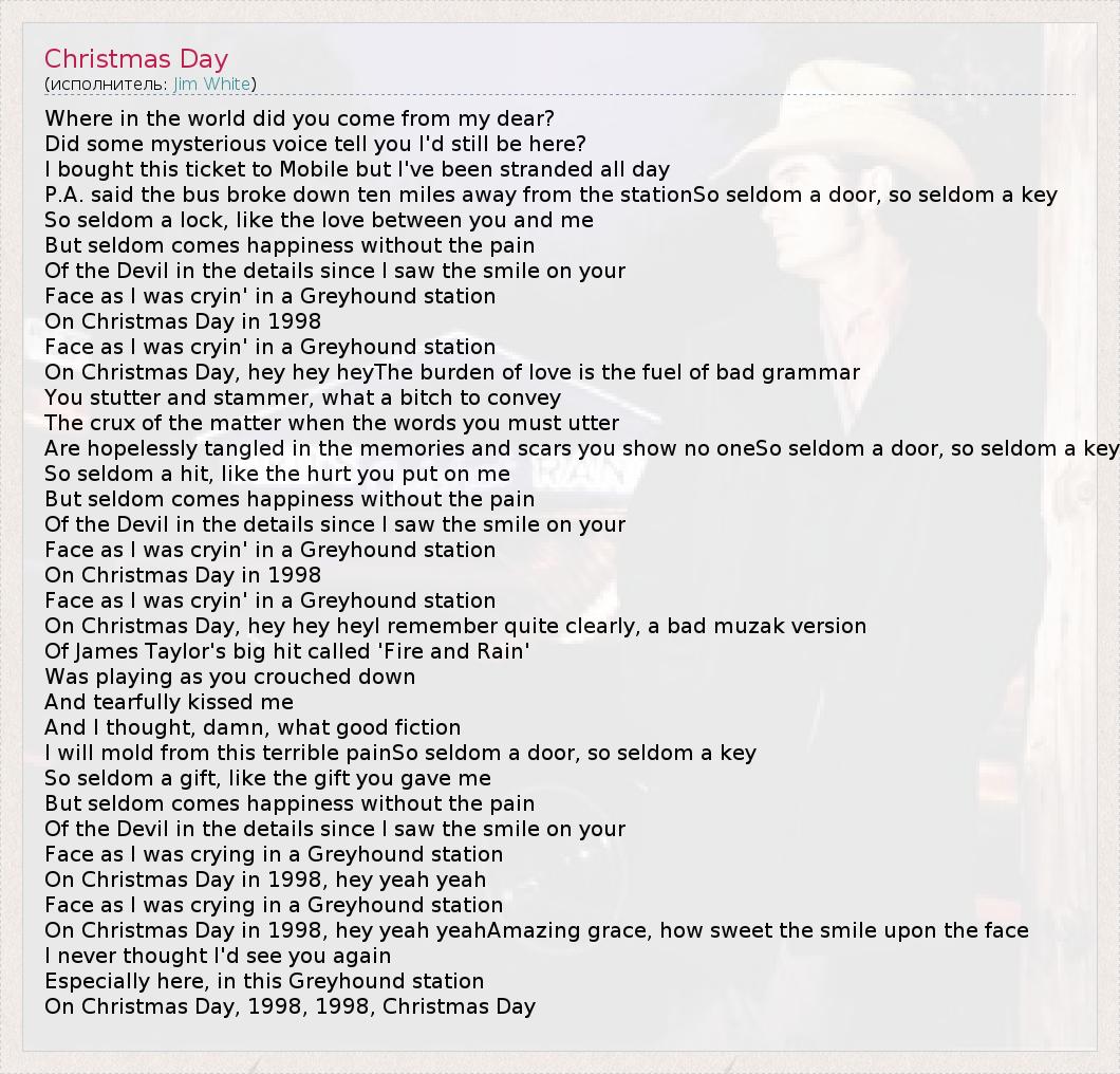 Where in the world did you come from my dear? Did some mysterious voice tell you I'd still be here? I bought this ticket to Mobile but I've been stranded all day P.A. said the bus broke down ten miles away from the stationSo seldom a door, so seldom a key So seldom a lock, like the love between you and me But seldom comes happiness without the pain Of the Devil in the details since I saw the smile on your Face as I was cryin' in a Greyhound station On Christmas Day in 1998 Face as I was cryin' in a Greyhound station On Christmas Day, hey hey heyThe burden of love is the fuel of bad grammar You stutter and stammer, what a bitch to convey The crux of the matter when the words you must utter Are hopelessly tangled in the memories and scars you show no oneSo seldom a door, so seldom a key So seldom a hit, like the hurt you put on me But seldom comes happiness without the pain Of the Devil in the details since I saw the smile on your Face as I was cryin' in a Greyhound station On Christmas Day in 1998 Face as I was cryin' in a Greyhound station On Christmas Day, hey hey heyI remember quite clearly, a bad muzak version Of James Taylor's big hit called 'Fire and Rain' Was playing as you crouched down And tearfully kissed me And I thought, damn, what good fiction I will mold from this terrible painSo seldom a door, so seldom a key So seldom a gift, like the gift you gave me But seldom comes happiness without the pain Of the Devil in the details since I saw the smile on your Face as I was crying in a Greyhound station On Christmas Day in 1998, hey yeah yeah Face as I was crying in a Greyhound station On Christmas Day in 1998, hey yeah yeahAmazing grace, how sweet the smile upon the face I never thought I'd see you again Especially here, in this Greyhound station On Christmas Day, 1998, 1998, Christmas Day