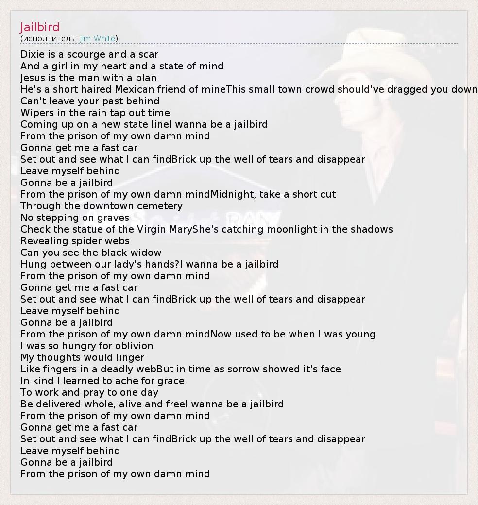 Dixie is a scourge and a scar And a girl in my heart and a state of mind Jesus is the man with a plan He's a short haired Mexican friend of mineThis small town crowd should've dragged you down Can't leave your past behind Wipers in the rain tap out time Coming up on a new state lineI wanna be a jailbird From the prison of my own damn mind Gonna get me a fast car Set out and see what I can findBrick up the well of tears and disappear Leave myself behind Gonna be a jailbird From the prison of my own damn mindMidnight, take a short cut Through the downtown cemetery No stepping on graves Check the statue of the Virgin MaryShe's catching moonlight in the shadows Revealing spider webs Can you see the black widow Hung between our lady's hands?I wanna be a jailbird From the prison of my own damn mind Gonna get me a fast car Set out and see what I can findBrick up the well of tears and disappear Leave myself behind Gonna be a jailbird From the prison of my own damn mindNow used to be when I was young I was so hungry for oblivion My thoughts would linger Like fingers in a deadly webBut in time as sorrow showed it's face In kind I learned to ache for grace To work and pray to one day Be delivered whole, alive and freeI wanna be a jailbird From the prison of my own damn mind Gonna get me a fast car Set out and see what I can findBrick up the well of tears and disappear Leave myself behind Gonna be a jailbird From the prison of my own damn mind