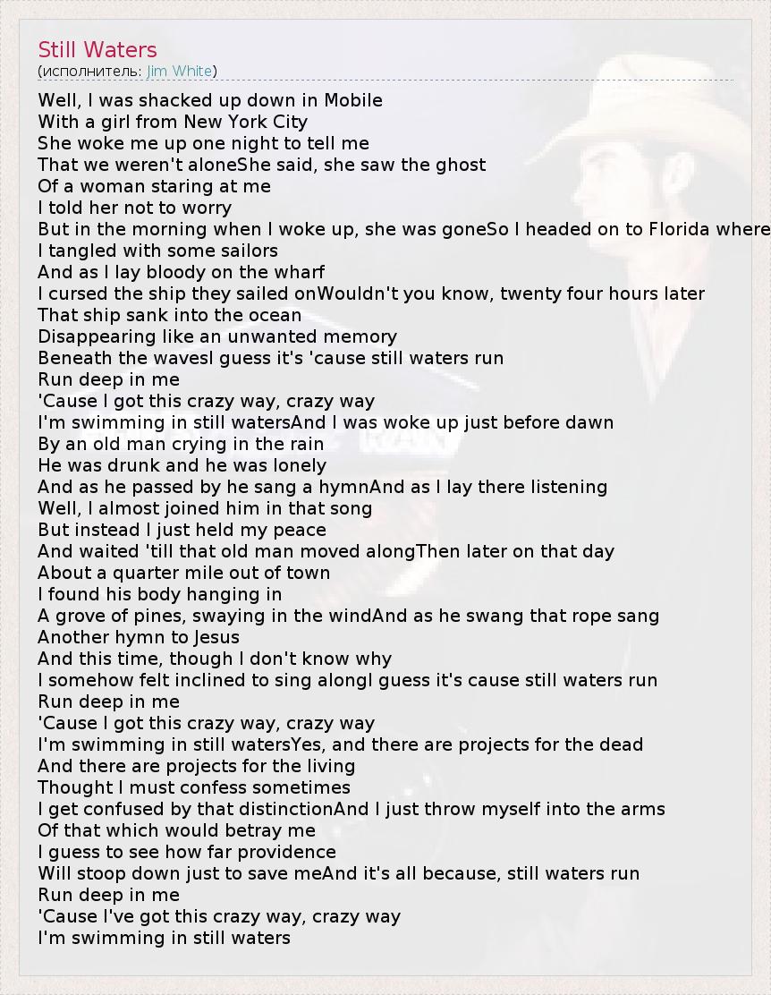 Well, I was shacked up down in Mobile With a girl from New York City She woke me up one night to tell me That we weren't aloneShe said, she saw the ghost Of a woman staring at me I told her not to worry But in the morning when I woke up, she was goneSo I headed on to Florida where I tangled with some sailors And as I lay bloody on the wharf I cursed the ship they sailed onWouldn't you know, twenty four hours later That ship sank into the ocean Disappearing like an unwanted memory Beneath the wavesI guess it's 'cause still waters run Run deep in me 'Cause I got this crazy way, crazy way I'm swimming in still watersAnd I was woke up just before dawn By an old man crying in the rain He was drunk and he was lonely And as he passed by he sang a hymnAnd as I lay there listening Well, I almost joined him in that song But instead I just held my peace And waited 'till that old man moved alongThen later on that day About a quarter mile out of town I found his body hanging in A grove of pines, swaying in the windAnd as he swang that rope sang Another hymn to Jesus And this time, though I don't know why I somehow felt inclined to sing alongI guess it's cause still waters run Run deep in me 'Cause I got this crazy way, crazy way I'm swimming in still watersYes, and there are projects for the dead And there are projects for the living Thought I must confess sometimes I get confused by that distinctionAnd I just throw myself into the arms Of that which would betray me I guess to see how far providence Will stoop down just to save meAnd it's all because, still waters run Run deep in me 'Cause I've got this crazy way, crazy way I'm swimming in still waters