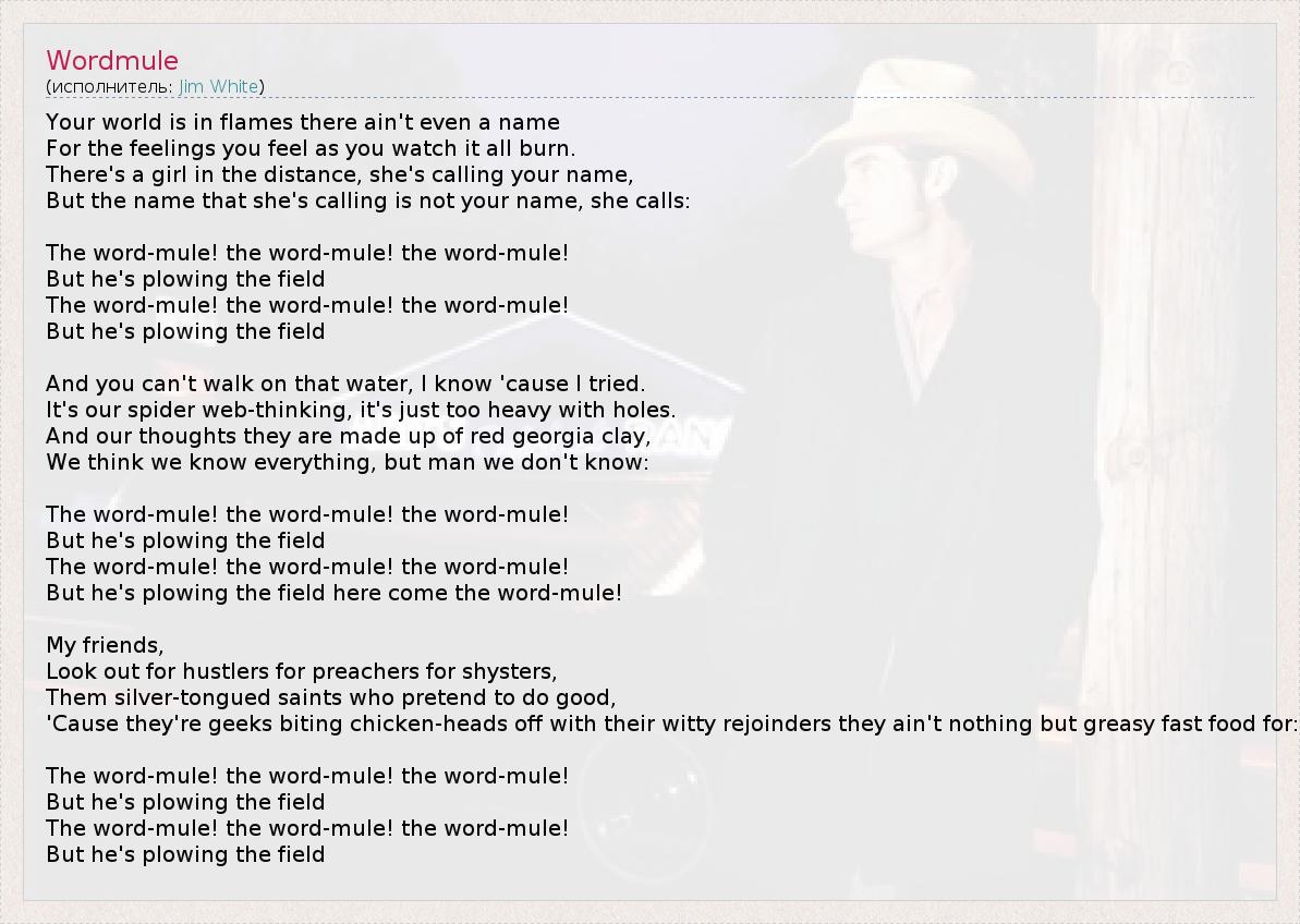 Your world is in flames there ain't even a name For the feelings you feel as you watch it all burn. There's a girl in the distance, she's calling your name, But the name that she's calling is not your name, she calls: The word-mule! the word-mule! the word-mule! But he's plowing the field The word-mule! the word-mule! the word-mule! But he's plowing the field And you can't walk on that water, I know 'cause I tried. It's our spider web-thinking, it's just too heavy with holes. And our thoughts they are made up of red georgia clay, We think we know everything, but man we don't know: The word-mule! the word-mule! the word-mule! But he's plowing the field The word-mule! the word-mule! the word-mule! But he's plowing the field here come the word-mule! My friends, Look out for hustlers for preachers for shysters, Them silver-tongued saints who pretend to do good, 'Cause they're geeks biting chicken-heads off with their witty rejoinders they ain't nothing but greasy fast food for: The word-mule! the word-mule! the word-mule! But he's plowing the field The word-mule! the word-mule! the word-mule! But he's plowing the field