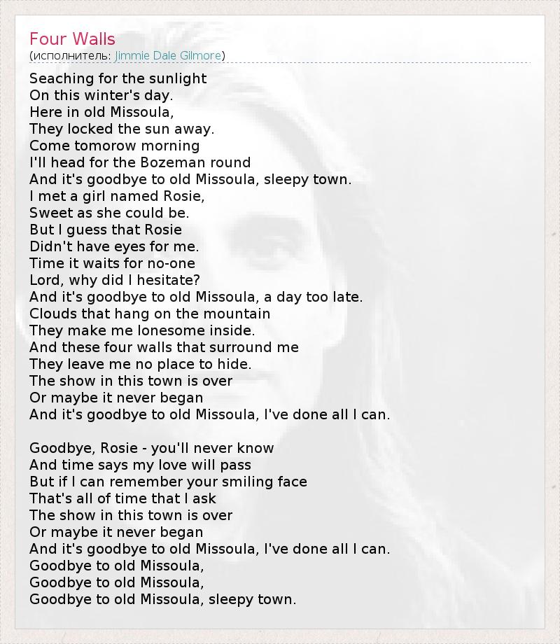 Seaching for the sunlight On this winter's day. Here in old Missoula, They locked the sun away. Come tomorow morning I'll head for the Bozeman round And it's goodbye to old Missoula, sleepy town. I met a girl named Rosie, Sweet as she could be. But I guess that Rosie Didn't have eyes for me. Time it waits for no-one Lord, why did I hesitate? And it's goodbye to old Missoula, a day too late. Clouds that hang on the mountain They make me lonesome inside. And these four walls that surround me They leave me no place to hide. The show in this town is over Or maybe it never began And it's goodbye to old Missoula, I've done all I can. Goodbye, Rosie - you'll never know And time says my love will pass But if I can remember your smiling face That's all of time that I ask The show in this town is over Or maybe it never began And it's goodbye to old Missoula, I've done all I can. Goodbye to old Missoula, Goodbye to old Missoula, Goodbye to old Missoula, sleepy town.