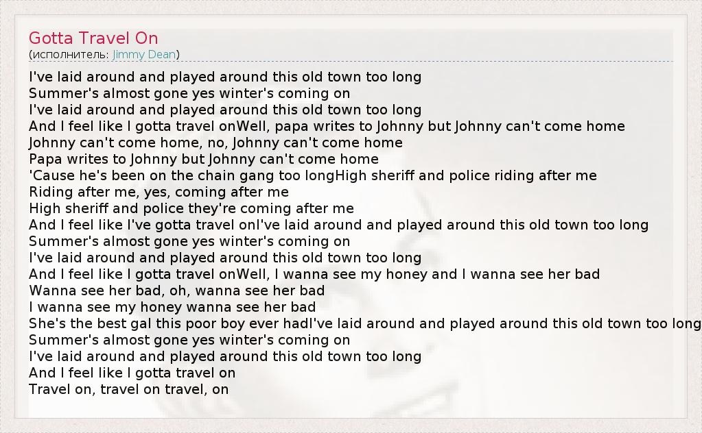 А как ты думаешь, о чем песня "Gotta Travel On" ?