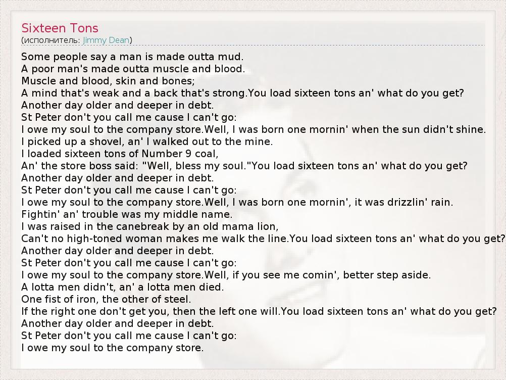 А как ты думаешь, о чем песня "Sixteen Tons" ?