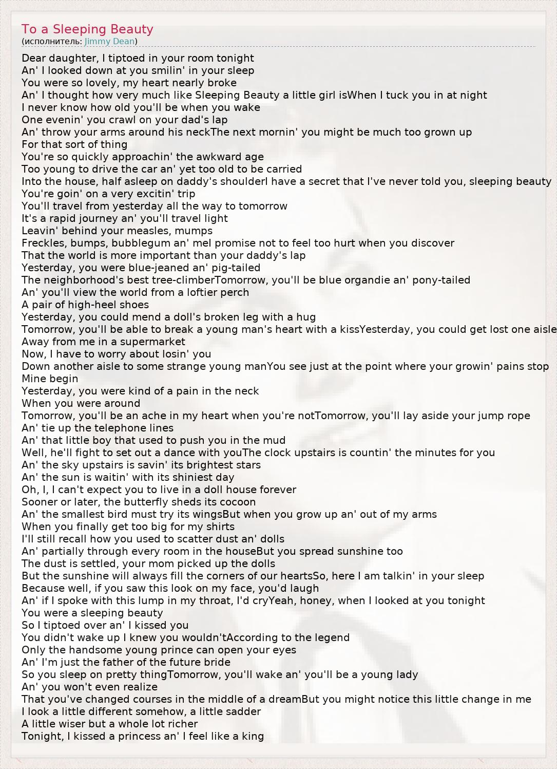 Dear daughter, I tiptoed in your room tonight An' I looked down at you smilin' in your sleep You were so lovely, my heart nearly broke An' I thought how very much like Sleeping Beauty a little girl isWhen I tuck you in at night I never know how old you'll be when you wake One evenin' you crawl on your dad's lap An' throw your arms around his neckThe next mornin' you might be much too grown up For that sort of thing You're so quickly approachin' the awkward age Too young to drive the car an' yet too old to be carried Into the house, half asleep on daddy's shoulderI have a secret that I've never told you, sleeping beauty You're goin' on a very excitin' trip You'll travel from yesterday all the way to tomorrow It's a rapid journey an' you'll travel light Leavin' behind your measles, mumps Freckles, bumps, bubblegum an' meI promise not to feel too hurt when you discover That the world is more important than your daddy's lap Yesterday, you were blue-jeaned an' pig-tailed The neighborhood's best tree-climberTomorrow, you'll be blue organdie an' pony-tailed An' you'll view the world from a loftier perch A pair of high-heel shoes Yesterday, you could mend a doll's broken leg with a hug Tomorrow, you'll be able to break a young man's heart with a kissYesterday, you could get lost one aisle Away from me in a supermarket Now, I have to worry about losin' you Down another aisle to some strange young manYou see just at the point where your growin' pains stop Mine begin Yesterday, you were kind of a pain in the neck When you were around Tomorrow, you'll be an ache in my heart when you're notTomorrow, you'll lay aside your jump rope An' tie up the telephone lines An' that little boy that used to push you in the mud Well, he'll fight to set out a dance with youThe clock upstairs is countin' the minutes for you An' the sky upstairs is savin' its brightest stars An' the sun is waitin' with its shiniest day Oh, I, I can't expect you to live in a doll house forever Sooner or later, the butterfly sheds its cocoon An' the smallest bird must try its wingsBut when you grow up an' out of my arms When you finally get too big for my shirts I'll still recall how you used to scatter dust an' dolls An' partially through every room in the houseBut you spread sunshine too The dust is settled, your mom picked up the dolls But the sunshine will always fill the corners of our heartsSo, here I am talkin' in your sleep Because well, if you saw this look on my face, you'd laugh An' if I spoke with this lump in my throat, I'd cryYeah, honey, when I looked at you tonight You were a sleeping beauty So I tiptoed over an' I kissed you You didn't wake up I knew you wouldn'tAccording to the legend Only the handsome young prince can open your eyes An' I'm just the father of the future bride So you sleep on pretty thingTomorrow, you'll wake an' you'll be a young lady An' you won't even realize That you've changed courses in the middle of a dreamBut you might notice this little change in me I look a little different somehow, a little sadder A little wiser but a whole lot richer Tonight, I kissed a princess an' I feel like a king