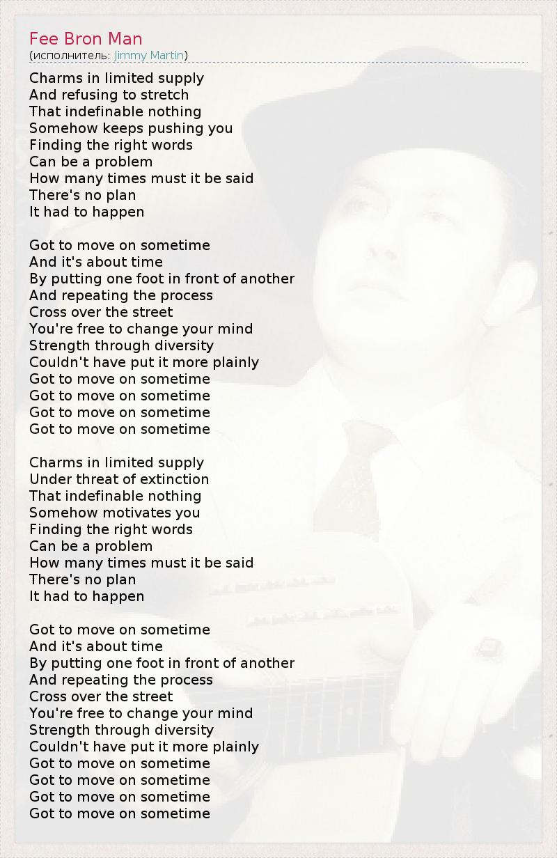Charms in limited supply And refusing to stretch That indefinable nothing Somehow keeps pushing you Finding the right words Can be a problem How many times must it be said There's no plan It had to happen Got to move on sometime And it's about time By putting one foot in front of another And repeating the process Cross over the street You're free to change your mind Strength through diversity Couldn't have put it more plainly Got to move on sometime Got to move on sometime Got to move on sometime Got to move on sometime Charms in limited supply Under threat of extinction That indefinable nothing Somehow motivates you Finding the right words Can be a problem How many times must it be said There's no plan It had to happen Got to move on sometime And it's about time By putting one foot in front of another And repeating the process Cross over the street You're free to change your mind Strength through diversity Couldn't have put it more plainly Got to move on sometime Got to move on sometime Got to move on sometime Got to move on sometime