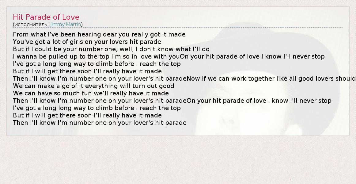 Then I'll know I'm number one on your lover's hit paradeOn your hit parade of love I know I'll never stop