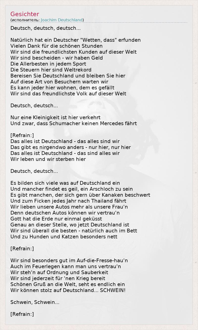 Немцы, немцы, немцы... Конечно же, это немец придумал передачу "Спорим что..."*. Большое спасибо за столько приятных часов. Мы самые дружелюбные покупатели в мире, Мы скромны – у нас есть деньги. Мы самые лучшие во всех видах спорта, Налоги у нас - это мировой рекорд. Приезжайте в Германию и оставайтесь здесь, Таких гостей мы очень ждем. Здесь может жить любой, кому это понравится, Мы самый дружелюбный народ на земле. Немцы, немцы... У нас всего одно недоразумение, Да и то оно в том, что Шумахер не ездит на Мерседесе**. [Припев:] Это все Германия – это все мы, Больше вы нигде такого не найдете – только у нас, только у нас. Это все Германия – это все мы, Мы живем и умираем здесь. Немцы, немцы... Многие придумывают о немцах много всякой ерунды, Многим нравиться быть засранцами. Есть много тех, кто любит жаловаться на иностранцев И ездить трах*ться в Таиланд. Мы любим наши машины больше, чем наших женщин, Потому что немецким машинам мы можем доверять. Бог поцеловал Землю всего один раз И именно там, где сейчас находиться Германия. Мы всюду самые лучшие – и, конечно же, в постели, А еще мы очень хорошо обращаемся с собаками и кошками. [Припев:] Мы особенно хороши, если надо кому-то набить морду, А еще нам можно доверить зажечь костер. Мы выступаем за порядок и чистоту, Мы в любое время готовы к войне. Привет всему миру, пора, наконец, осознать Что мы можем гордиться немецким ... ШВАЙН! Швайн, швайн... [Припев:] * популярное в Германии ТВ-шоу. ** на момент написания песни (2001 г.) Михаэль Шумахер был пилотом "Ferrari".