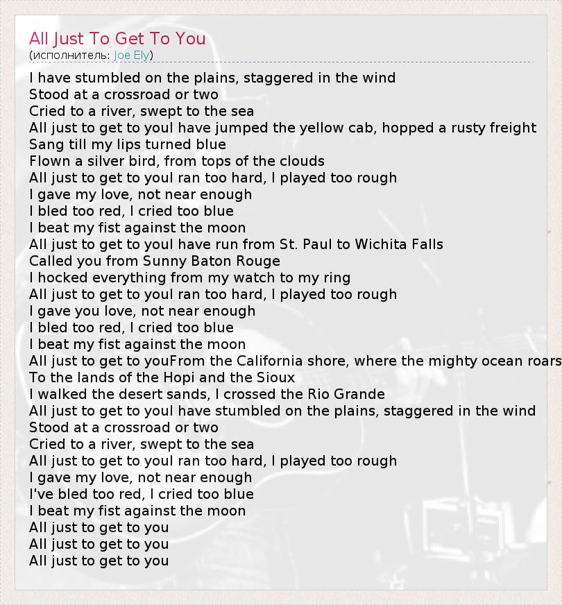 I have stumbled on the plains, staggered in the wind Stood at a crossroad or two Cried to a river, swept to the sea All just to get to youI have jumped the yellow cab, hopped a rusty freight Sang till my lips turned blue Flown a silver bird, from tops of the clouds All just to get to youI ran too hard, I played too rough I gave my love, not near enough I bled too red, I cried too blue I beat my fist against the moon All just to get to youI have run from St. Paul to Wichita Falls Called you from Sunny Baton Rouge I hocked everything from my watch to my ring All just to get to youI ran too hard, I played too rough I gave you love, not near enough I bled too red, I cried too blue I beat my fist against the moon All just to get to youFrom the California shore, where the mighty ocean roars To the lands of the Hopi and the Sioux I walked the desert sands, I crossed the Rio Grande All just to get to youI have stumbled on the plains, staggered in the wind Stood at a crossroad or two Cried to a river, swept to the sea All just to get to youI ran too hard, I played too rough I gave my love, not near enough I've bled too red, I cried too blue I beat my fist against the moon All just to get to you All just to get to you All just to get to you