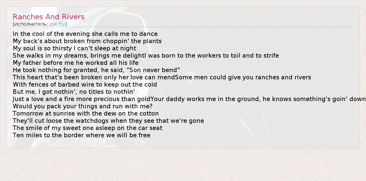 А как ты думаешь, о чем песня "Ranches And Rivers" ?
