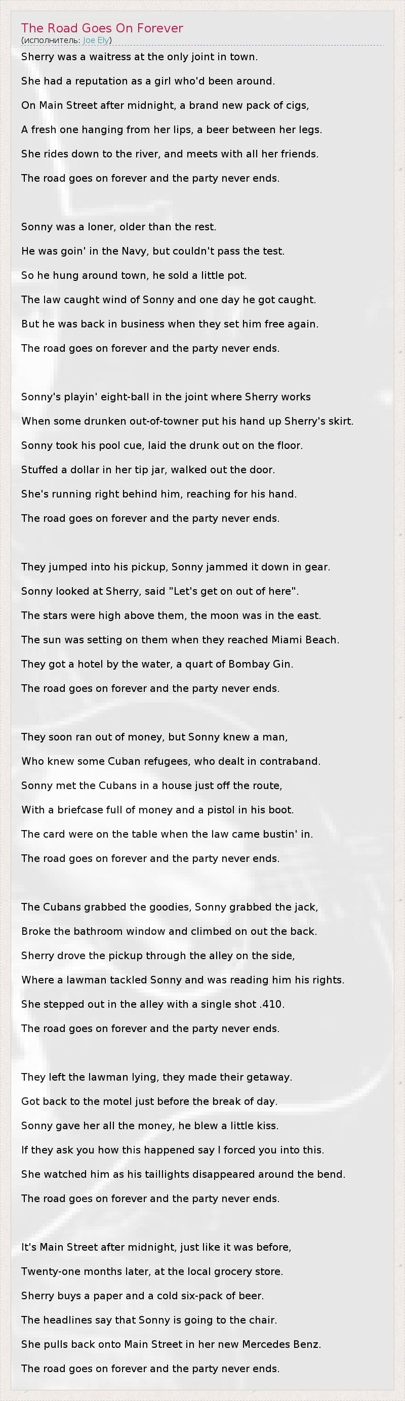 А как ты думаешь, о чем песня "The Road Goes On Forever" ?