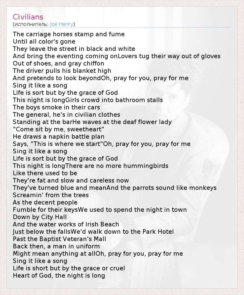 The carriage horses stamp and fume Until all color's gone They leave the street in black and white And bring the eventing coming onLovers tug their way out of gloves Out of shoes, and gray chiffon The driver pulls his blanket high And pretends to look beyondOh, pray for you, pray for me Sing it like a song Life is sort but by the grace of God This night is longGirls crowd into bathroom stalls The boys smoke in their cars The general, he's in civilian clothes Standing at the barHe waves at the deaf flower lady "Come sit by me, sweetheart" He draws a napkin battle plan Says, "This is where we start"Oh, pray for you, pray for me Sing it like a song Life is sort but by the grace of God This night is longThere are no more hummingbirds Like there used to be They're fat and slow and careless now They've turned blue and meanAnd the parrots sound like monkeys Screamin' from the trees As the decent people Fumble for their keysWe used to spend the night in town Down by City Hall And the water works of Irish Beach Just below the fallsWe'd walk down to the Park Hotel Past the Baptist Veteran's Mall Back then, a man in uniform Might mean anything at allOh, pray for you, pray for me Sing it like a song Life is short but by the grace or cruel Heart of God, the night is long