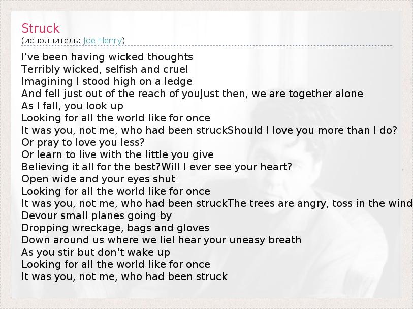 I've been having wicked thoughts Terribly wicked, selfish and cruel Imagining I stood high on a ledge And fell just out of the reach of youJust then, we are together alone As I fall, you look up Looking for all the world like for once It was you, not me, who had been struckShould I love you more than I do? Or pray to love you less? Or learn to live with the little you give Believing it all for the best?Will I ever see your heart? Open wide and your eyes shut Looking for all the world like for once It was you, not me, who had been struckThe trees are angry, toss in the wind Devour small planes going by Dropping wreckage, bags and gloves Down around us where we lieI hear your uneasy breath As you stir but don't wake up Looking for all the world like for once It was you, not me, who had been struck