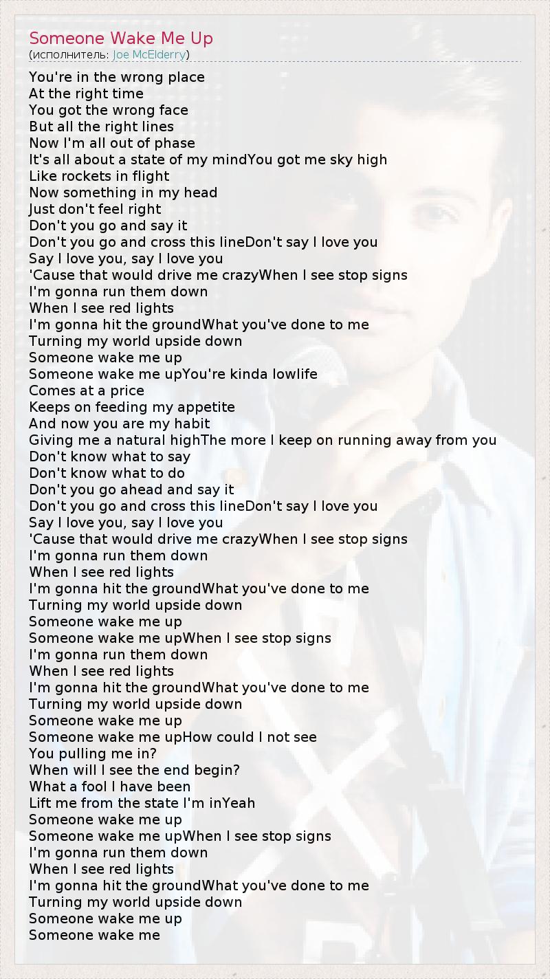 You're in the wrong place At the right time You got the wrong face But all the right lines Now I'm all out of phase It's all about a state of my mindYou got me sky high Like rockets in flight Now something in my head Just don't feel right Don't you go and say it Don't you go and cross this lineDon't say I love you Say I love you, say I love you 'Cause that would drive me crazyWhen I see stop signs I'm gonna run them down When I see red lights I'm gonna hit the groundWhat you've done to me Turning my world upside down Someone wake me up Someone wake me upYou're kinda lowlife Comes at a price Keeps on feeding my appetite And now you are my habit Giving me a natural highThe more I keep on running away from you Don't know what to say Don't know what to do Don't you go ahead and say it Don't you go and cross this lineDon't say I love you Say I love you, say I love you 'Cause that would drive me crazyWhen I see stop signs I'm gonna run them down When I see red lights I'm gonna hit the groundWhat you've done to me Turning my world upside down Someone wake me up Someone wake me upWhen I see stop signs I'm gonna run them down When I see red lights I'm gonna hit the groundWhat you've done to me Turning my world upside down Someone wake me up Someone wake me upHow could I not see You pulling me in? When will I see the end begin? What a fool I have been Lift me from the state I'm inYeah Someone wake me up Someone wake me upWhen I see stop signs I'm gonna run them down When I see red lights I'm gonna hit the groundWhat you've done to me Turning my world upside down Someone wake me up Someone wake me