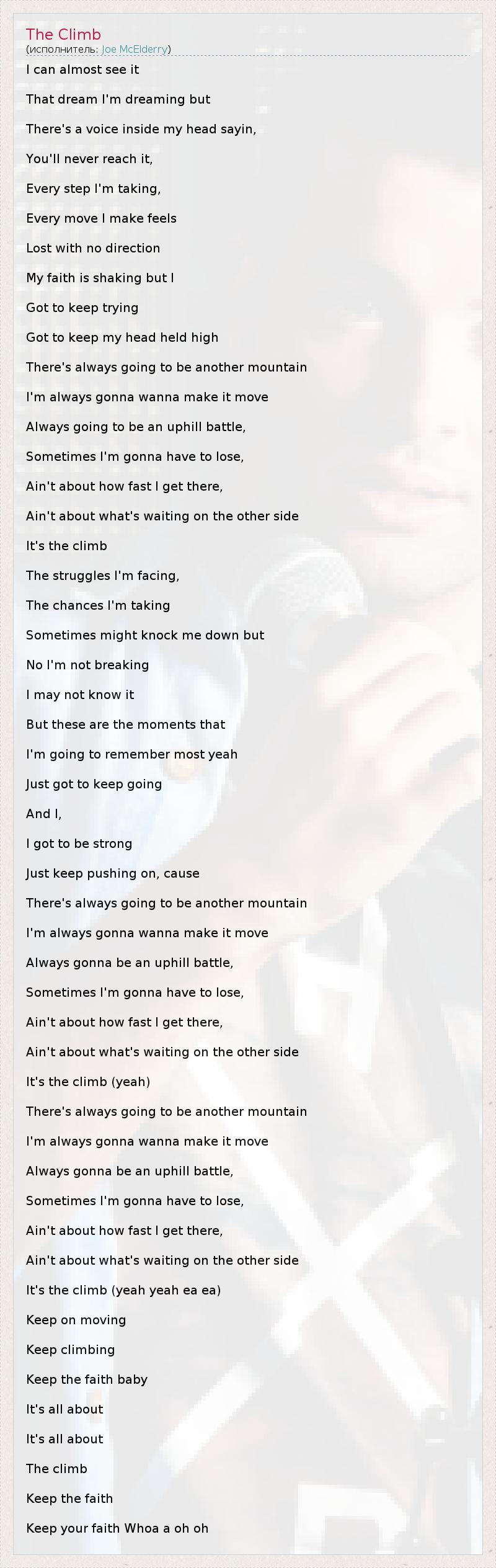 I can almost see it That dream I'm dreaming but There's a voice inside my head sayin, You'll never reach it, Every step I'm taking, Every move I make feels Lost with no direction My faith is shaking but I Got to keep trying Got to keep my head held high There's always going to be another mountain I'm always gonna wanna make it move Always going to be an uphill battle, Sometimes I'm gonna have to lose, Ain't about how fast I get there, Ain't about what's waiting on the other side It's the climb The struggles I'm facing, The chances I'm taking Sometimes might knock me down but No I'm not breaking I may not know it But these are the moments that I'm going to remember most yeah Just got to keep going And I, I got to be strong Just keep pushing on, cause There's always going to be another mountain I'm always gonna wanna make it move Always gonna be an uphill battle, Sometimes I'm gonna have to lose, Ain't about how fast I get there, Ain't about what's waiting on the other side It's the climb (yeah) There's always going to be another mountain I'm always gonna wanna make it move Always gonna be an uphill battle, Sometimes I'm gonna have to lose, Ain't about how fast I get there, Ain't about what's waiting on the other side It's the climb (yeah yeah ea ea) Keep on moving Keep climbing Keep the faith baby It's all about It's all about The climb Keep the faith Keep your faith Whoa a oh oh