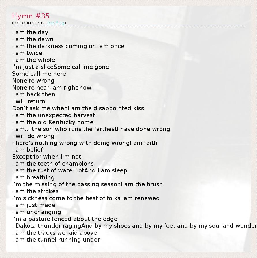 I am the day I am the dawn I am the darkness coming onI am once I am twice I am the whole I'm just a sliceSome call me gone Some call me here None're wrong None're nearI am right now I am back then I will return Don't ask me whenI am the disappointed kiss I am the unexpected harvest I am the old Kentucky home I am... the son who runs the farthestI have done wrong I will do wrong There's nothing wrong with doing wrongI am faith I am belief Except for when I'm not I am the teeth of champions I am the rust of water rotAnd I am sleep I am breathing I'm the missing of the passing seasonI am the brush I am the strokes I'm sickness come to the best of folksI am renewed I am just made I am unchanging I'm a pasture fenced about the edge I Dakota thunder ragingAnd by my shoes and by my feet and by my soul and wonder I am the tracks we laid above I am the tunnel running under
