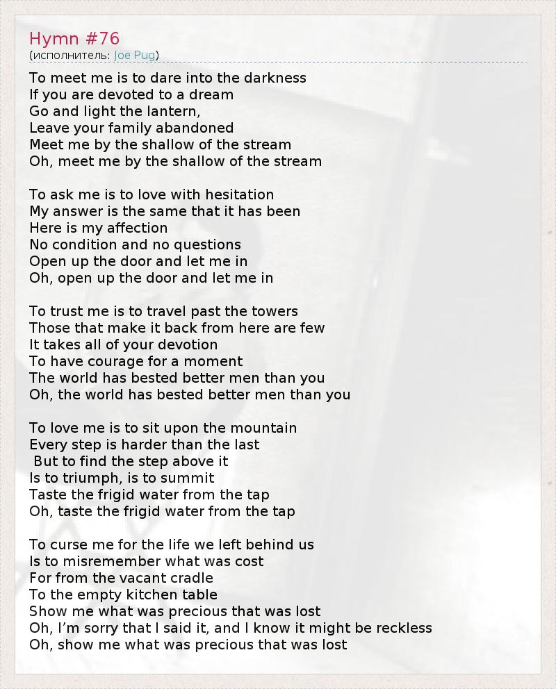 To meet me is to dare into the darkness If you are devoted to a dream Go and light the lantern, Leave your family abandoned Meet me by the shallow of the stream Oh, meet me by the shallow of the stream To ask me is to love with hesitation My answer is the same that it has been Here is my affection No condition and no questions Open up the door and let me in Oh, open up the door and let me in To trust me is to travel past the towers Those that make it back from here are few It takes all of your devotion To have courage for a moment The world has bested better men than you Oh, the world has bested better men than you To love me is to sit upon the mountain Every step is harder than the last But to find the step above it Is to triumph, is to summit Taste the frigid water from the tap Oh, taste the frigid water from the tap To curse me for the life we left behind us Is to misremember what was cost For from the vacant cradle To the empty kitchen table Show me what was precious that was lost Oh, I’m sorry that I said it, and I know it might be reckless Oh, show me what was precious that was lost