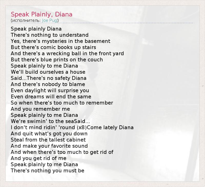 Speak plainly Diana There's nothing to understand Yes, there's mysteries in the basement But there's comic books up stairs And there's a wrecking ball in the front yard But there's blue prints on the couch Speak plainly to me Diana We'll build ourselves a house Said...There's no safety Diana And there's nobody to blame Even daylight will surprise you Even dreams will end the same So when there's too much to remember And you remember me Speak plainly to me Diana We're swimin' to the seaSaid... I don't mind ridin' 'round (x8)Come lately Diana And quit what's got you down Steal from the tallest cabinet And make your favorite sound And when there's too much to get rid of And you get rid of me Speak plainly to me Diana There's nothing you must be