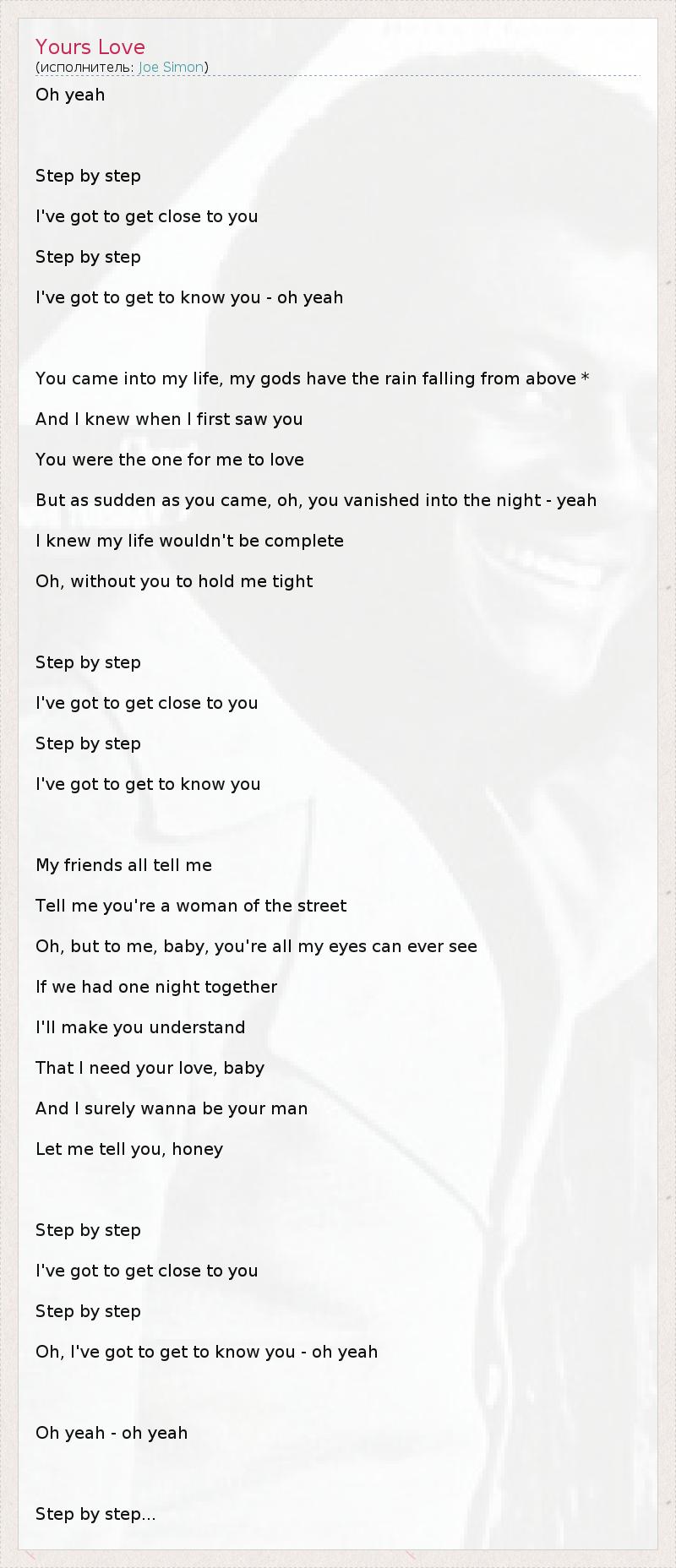Oh yeah Step by step I've got to get close to you Step by step I've got to get to know you - oh yeah You came into my life, my gods have the rain falling from above * And I knew when I first saw you You were the one for me to love But as sudden as you came, oh, you vanished into the night - yeah I knew my life wouldn't be complete Oh, without you to hold me tight Step by step I've got to get close to you Step by step I've got to get to know you My friends all tell me Tell me you're a woman of the street Oh, but to me, baby, you're all my eyes can ever see If we had one night together I'll make you understand That I need your love, baby And I surely wanna be your man Let me tell you, honey Step by step I've got to get close to you Step by step Oh, I've got to get to know you - oh yeah Oh yeah - oh yeah Step by step...
