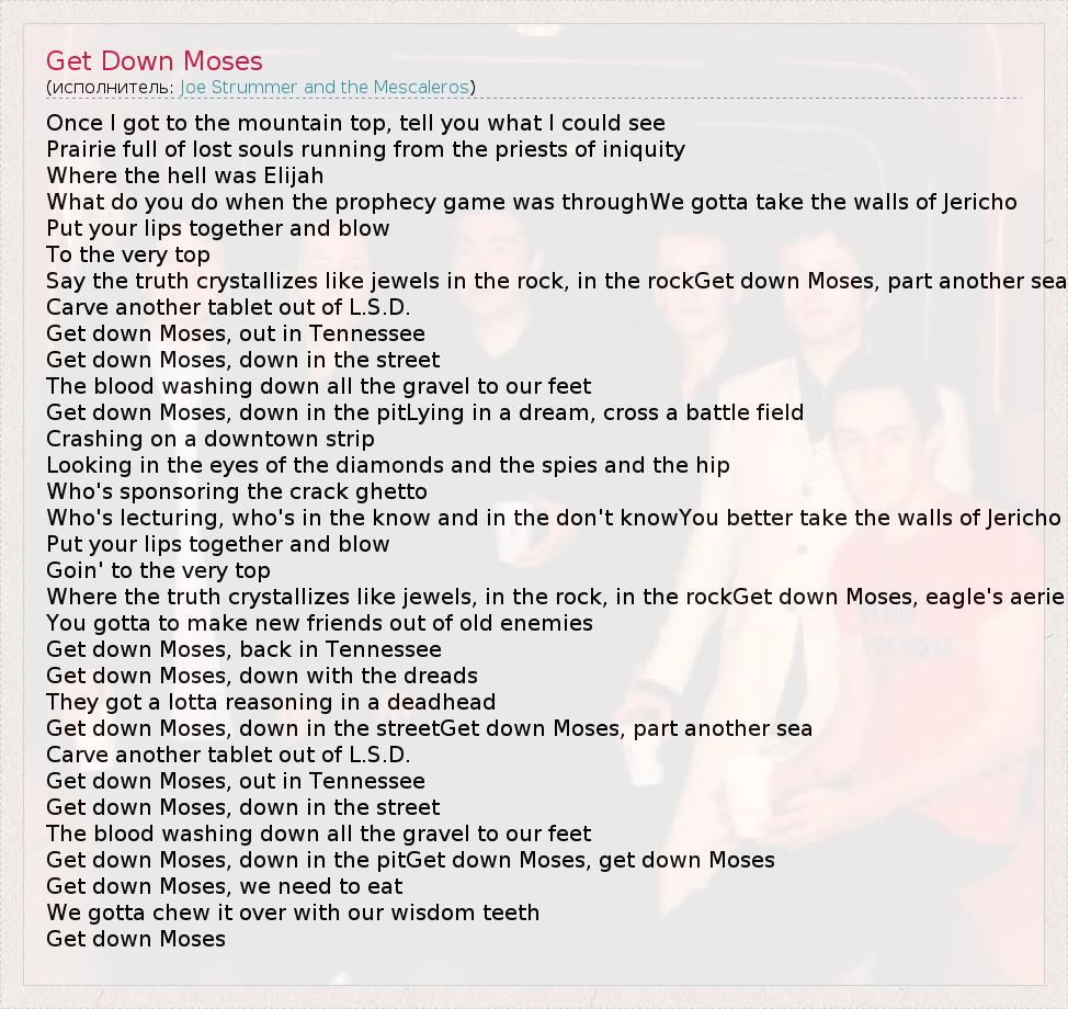 Once I got to the mountain top, tell you what I could see Prairie full of lost souls running from the priests of iniquity Where the hell was Elijah What do you do when the prophecy game was throughWe gotta take the walls of Jericho Put your lips together and blow To the very top Say the truth crystallizes like jewels in the rock, in the rockGet down Moses, part another sea Carve another tablet out of L.S.D. Get down Moses, out in Tennessee Get down Moses, down in the street The blood washing down all the gravel to our feet Get down Moses, down in the pitLying in a dream, cross a battle field Crashing on a downtown strip Looking in the eyes of the diamonds and the spies and the hip Who's sponsoring the crack ghetto Who's lecturing, who's in the know and in the don't knowYou better take the walls of Jericho Put your lips together and blow Goin' to the very top Where the truth crystallizes like jewels, in the rock, in the rockGet down Moses, eagle's aerie You gotta to make new friends out of old enemies Get down Moses, back in Tennessee Get down Moses, down with the dreads They got a lotta reasoning in a deadhead Get down Moses, down in the streetGet down Moses, part another sea Carve another tablet out of L.S.D. Get down Moses, out in Tennessee Get down Moses, down in the street The blood washing down all the gravel to our feet Get down Moses, down in the pitGet down Moses, get down Moses Get down Moses, we need to eat We gotta chew it over with our wisdom teeth Get down Moses