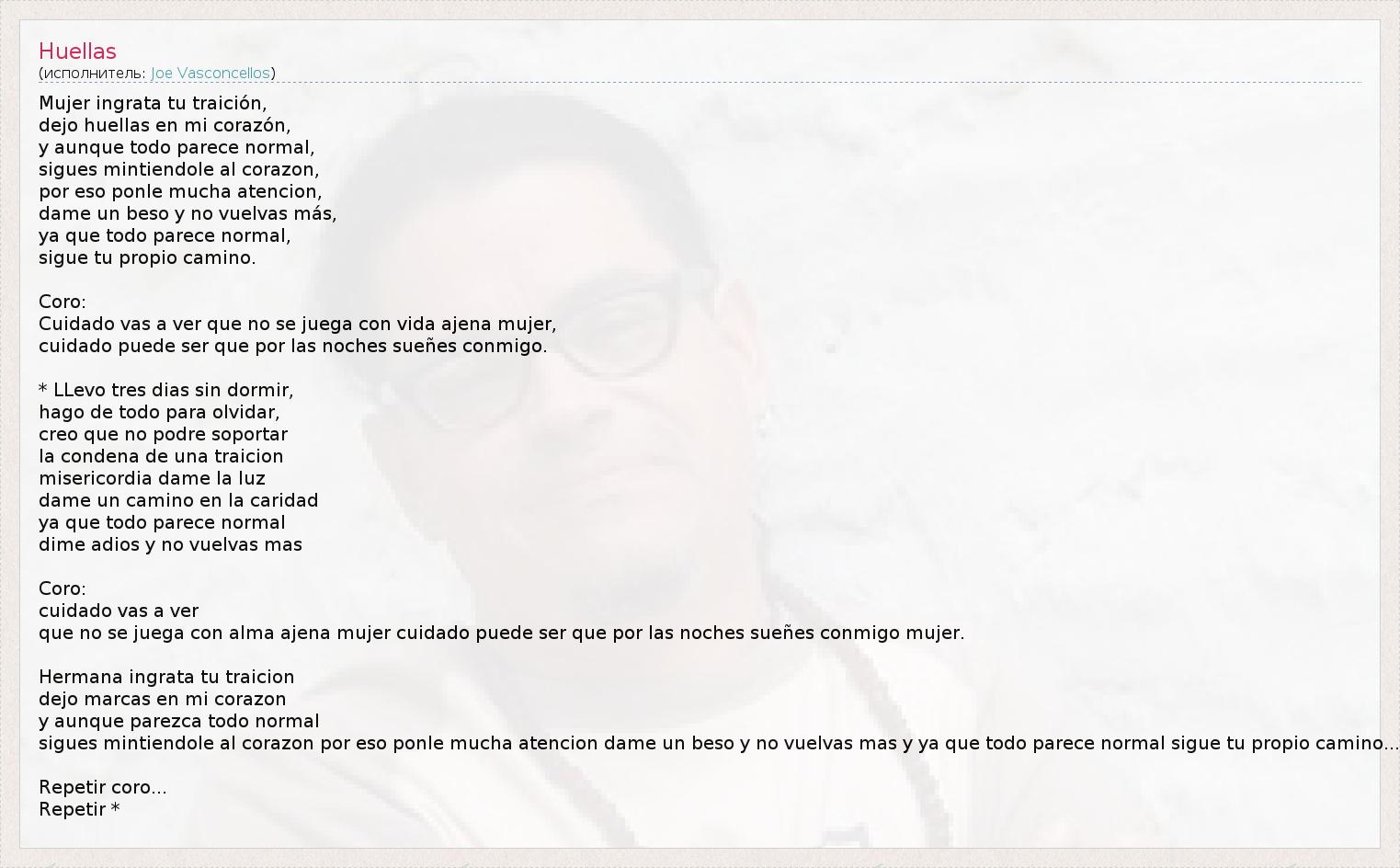 Mujer ingrata ту traición , dejo huellas ан миль corazón , у Aunque TODO parece нормально, sigues mintiendole аль Corazon , Пор ESO ponle Муха Atencion , Дама ООН Бесо у не vuelvas más , я Que TODO parece нормально, Sigue ту propio Камино . Коро : Не Cuidado VAS в вер Que не себе juega кон Вида ajena Mujer , Cuidado Puede сер Que POR -лас- Noches sueñes Conmigo . * LLevo Tres Dias грех Dormir , Hago де TODO пункт olvidar , Creo Que не podre soportar ла -де- уна condena traicion Misericordia дама -ла-Лус Дама ООН Камино ан ла Каридад я Que TODO parece нормально пруд Adios Y Нет vuelvas Рождество Коро : Cuidado VAS в вер Que не себе juega Кон Альма ajena Mujer Cuidado Puede сер Que POR -лас- Noches sueñes Conmigo Mujer . Hermana ingrata ту traicion dejo Marcas ан миль Corazon у Aunque parezca Todo нормально sigues mintiendole аль Corazon POR ESO ponle Муха Atencion дама ООН Бесо у не vuelvas фонтанной у Я. дие Todo parece нормально Sigue ту propio Camino ... Repetir Коро ... Repetir *
