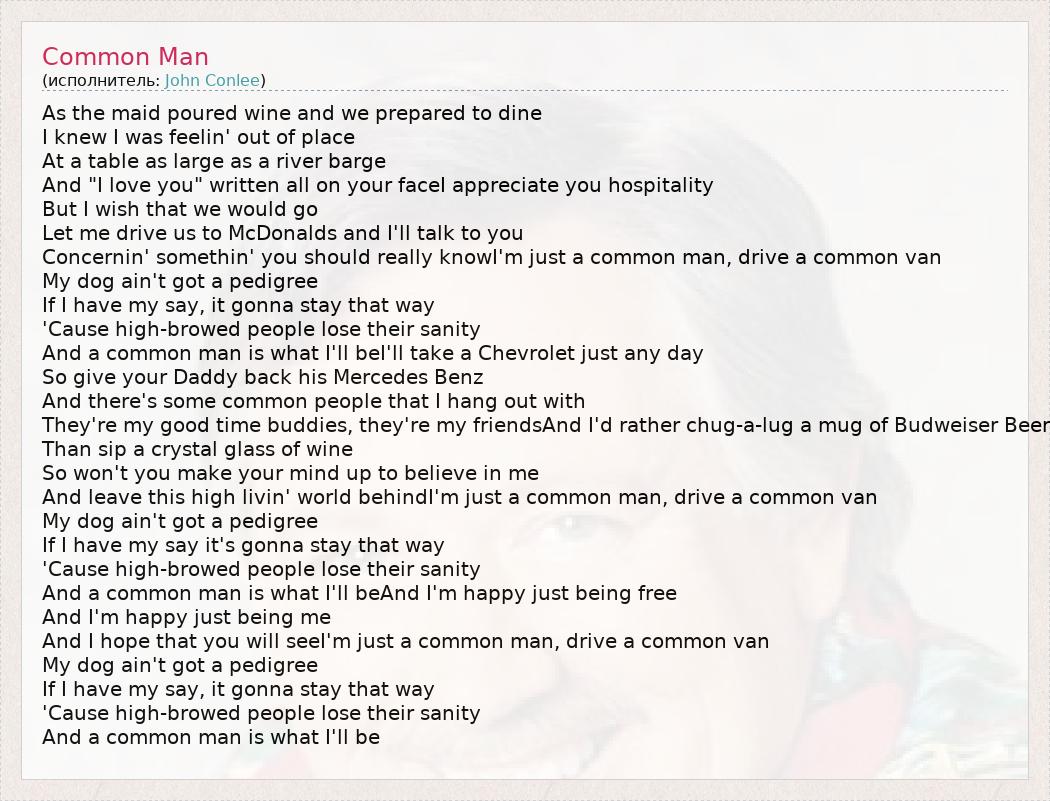As the maid poured wine and we prepared to dine I knew I was feelin' out of place At a table as large as a river barge And "I love you" written all on your faceI appreciate you hospitality But I wish that we would go Let me drive us to McDonalds and I'll talk to you Concernin' somethin' you should really knowI'm just a common man, drive a common van My dog ain't got a pedigree If I have my say, it gonna stay that way 'Cause high-browed people lose their sanity And a common man is what I'll beI'll take a Chevrolet just any day So give your Daddy back his Mercedes Benz And there's some common people that I hang out with They're my good time buddies, they're my friendsAnd I'd rather chug-a-lug a mug of Budweiser Beer Than sip a crystal glass of wine So won't you make your mind up to believe in me And leave this high livin' world behindI'm just a common man, drive a common van My dog ain't got a pedigree If I have my say it's gonna stay that way 'Cause high-browed people lose their sanity And a common man is what I'll beAnd I'm happy just being free And I'm happy just being me And I hope that you will seeI'm just a common man, drive a common van My dog ain't got a pedigree If I have my say, it gonna stay that way 'Cause high-browed people lose their sanity And a common man is what I'll be