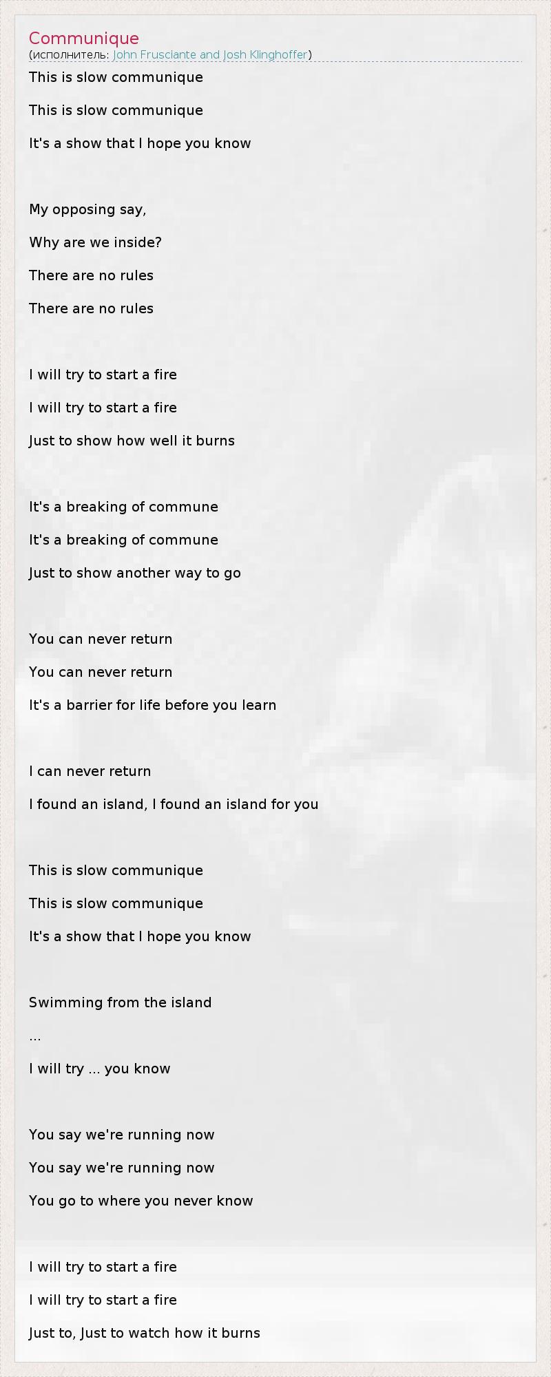 This is slow communique This is slow communique It's a show that I hope you know My opposing say, Why are we inside? There are no rules There are no rules I will try to start a fire I will try to start a fire Just to show how well it burns It's a breaking of commune It's a breaking of commune Just to show another way to go You can never return You can never return It's a barrier for life before you learn I can never return I found an island, I found an island for you This is slow communique This is slow communique It's a show that I hope you know Swimming from the island ... I will try ... you know You say we're running now You say we're running now You go to where you never know I will try to start a fire I will try to start a fire Just to, Just to watch how it burns