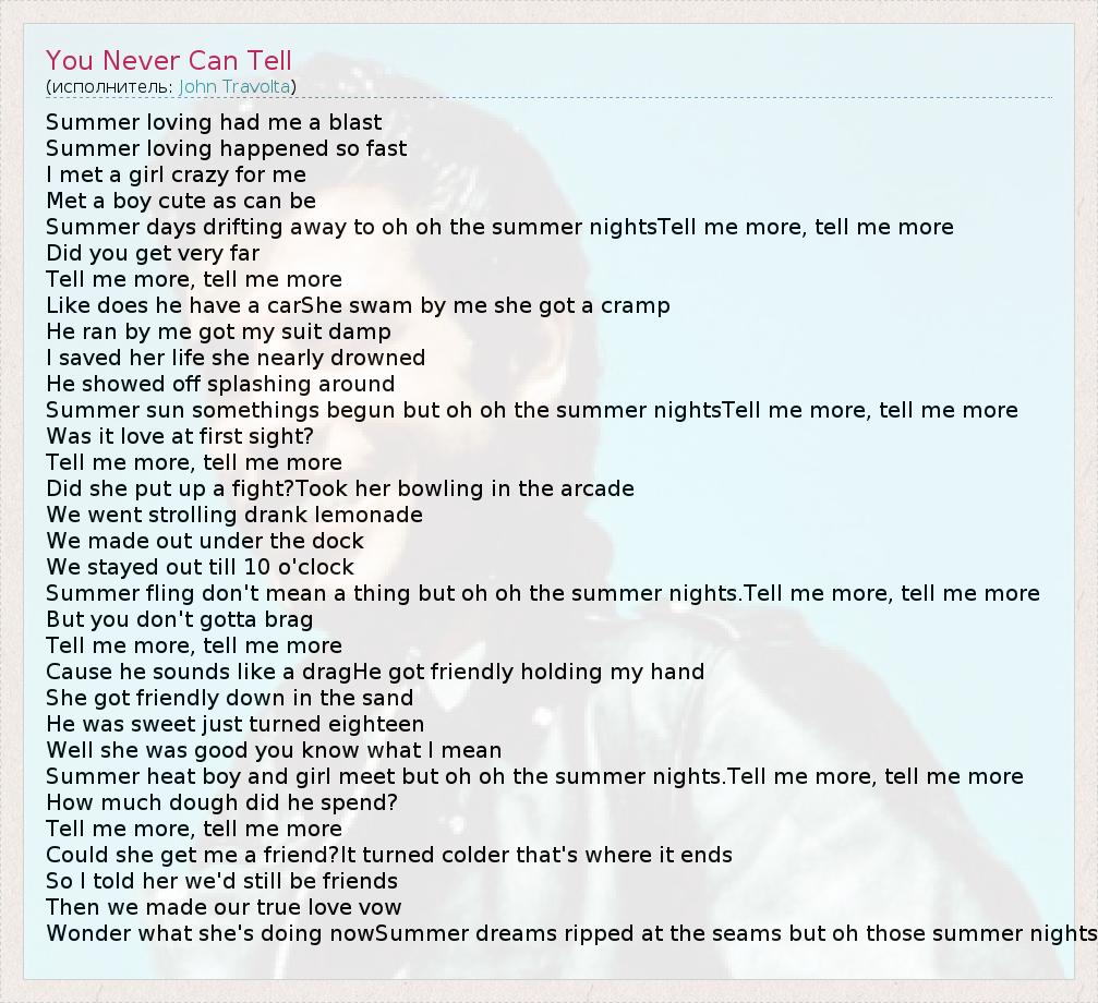Summer sun somethings begun but oh oh the summer nightsTell me more, tell me more