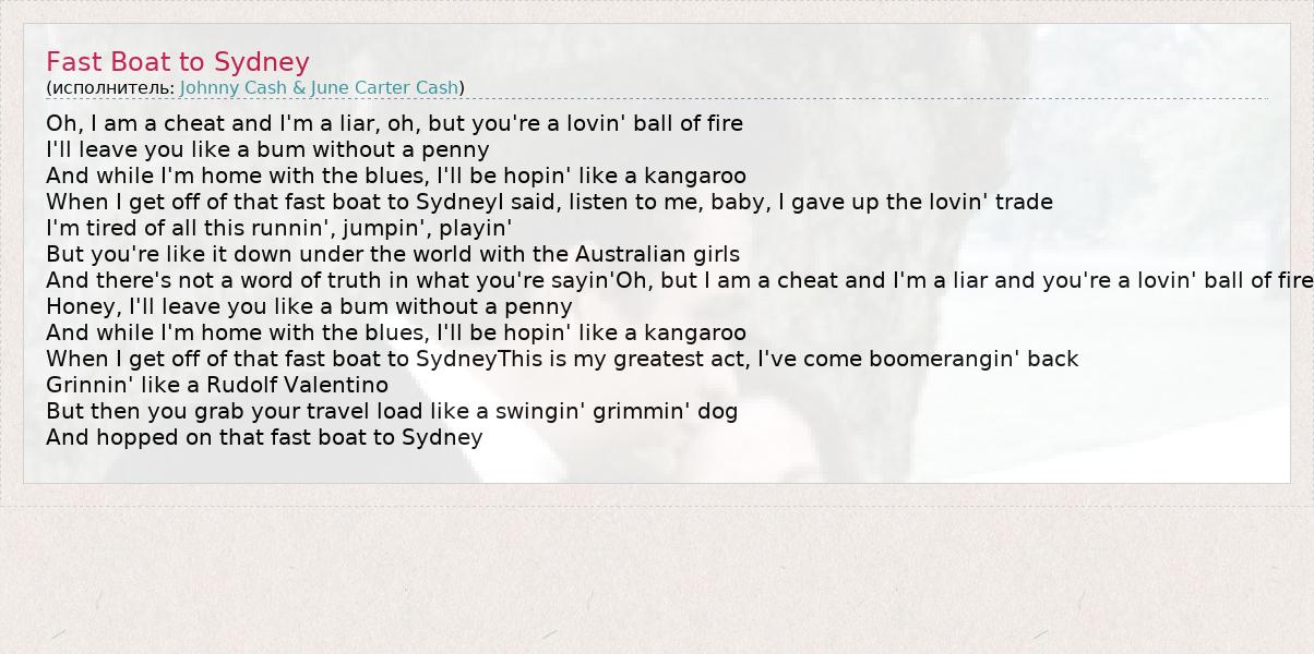 When I get off of that fast boat to SydneyI said, listen to me, baby, I gave up the lovin' trade