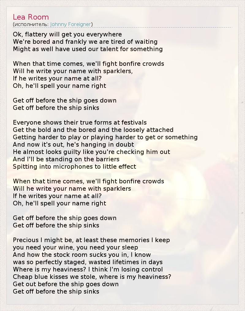 Ok, flattery will get you everywhere We're bored and frankly we are tired of waiting Might as well have used our talent for something When that time comes, we'll fight bonfire crowds Will he write your name with sparklers, If he writes your name at all? Oh, he'll spell your name right Get off before the ship goes down Get off before the ship sinks Everyone shows their true forms at festivals Get the bold and the bored and the loosely attached Getting harder to play or playing harder to get or something And now it's out, he's hanging in doubt He almost looks guilty like you're checking him out And I'll be standing on the barriers Spitting into microphones to little effect When that time comes, we'll fight bonfire crowds Will he write your name with sparklers If he writes your name at all? Oh, he'll spell your name right Get off before the ship goes down Get off before the ship sinks Precious I might be, at least these memories I keep you need your wine, you need your sleep And how the stock room sucks you in, I know was so perfectly staged, wasted lifetimes in days Where is my heaviness? I think I'm losing control Cheap blue kisses we stole, where is my heaviness? Get out before the ship goes down Get off before the ship sinks