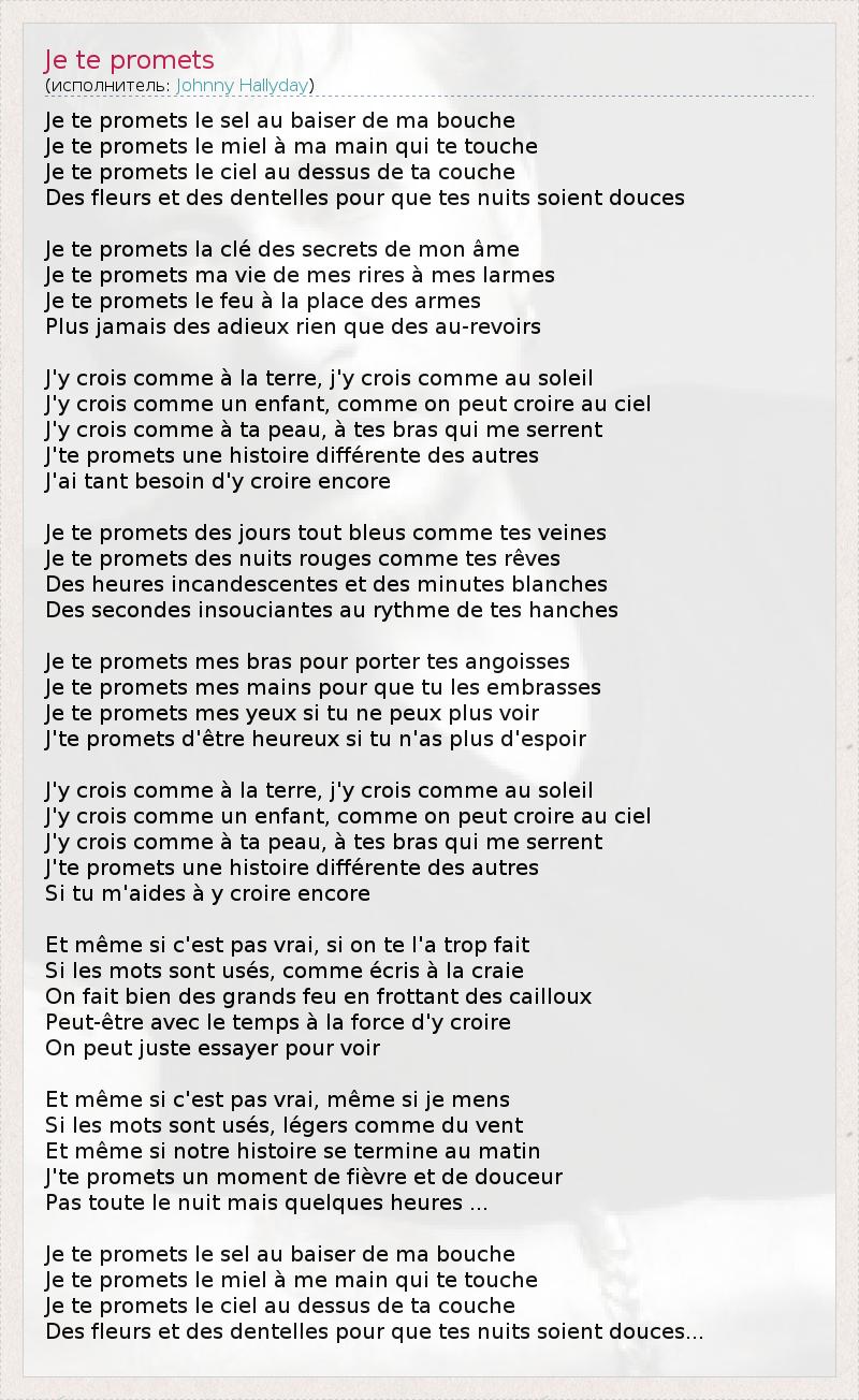 Обещаю тебе вкус соли в моих поцелуях, Обещаю тебе сладость меда в прикосновении моих рук, Обещаю тебе небо над твоей постелью, Цветы и кружева, чтобы сделать твои ночи нежными. Обещаю тебе ключ от тайн моего сердца, Обещаю тебе мою жизнь от смеха до слез, Обещаю тебе огонь вместо оружия, Чтоб говорить "до встречи" и никогда "прощай". Я верю, как на земле, я верю, как на солнце, Я верю, как ребенок, как верят в небо, Я верю, как твоя кожа, в твоих руках, которыми ты прижимаешь к себе. Обещаю тебе историю, которая будет отличаться от других, Мне так нужно в это верить. Обещаю тебе дни, цвет которых более синий, чем твои вены, Обещаю тебе красные ночи, как ты мечтала, Пылкие часы и тихие минуты, Беспечные секунды в ритме твоих бедер. Обещаю тебе, мои руки унесут твои тревоги, Обещаю тебе мои руки, чтобы ты их целовала, Обещаю тебе мои глаза, если ты перестанешь видеть, Обещаю, ты будешь счастлива, даже если умрет надежда. Я верю, как на земле, я верю, как на солнце, Я верю, как ребенок, как верят в небо, Я верю, как твоя кожа, в твоих руках, которыми ты прижимаешь к себе. Обещаю тебе историю, которая будет отличаться от других, Помоги мне в это поверить. И даже если это не так, если для тебя это слишком, Если сказанные слова - всего лишь надпись мелом, Нужно разжечь огонь трением камней, Может быть со временем силой веры. Мы попытаемся это увидеть И если это не так, если я лгу, Если сказанные слова переменчивы, как ветер, И если наша история закончится утром, Обещаю тебе горячие и нежные моменты Не всю ночь, но несколько часов... Обещаю тебе соль в моих поцелуях, Обещаю тебе мед в прикосновении моих рук, Обещаю тебе небо над твоей постелью, Цветы и кружева, чтобы сделать твои ночи нежными...