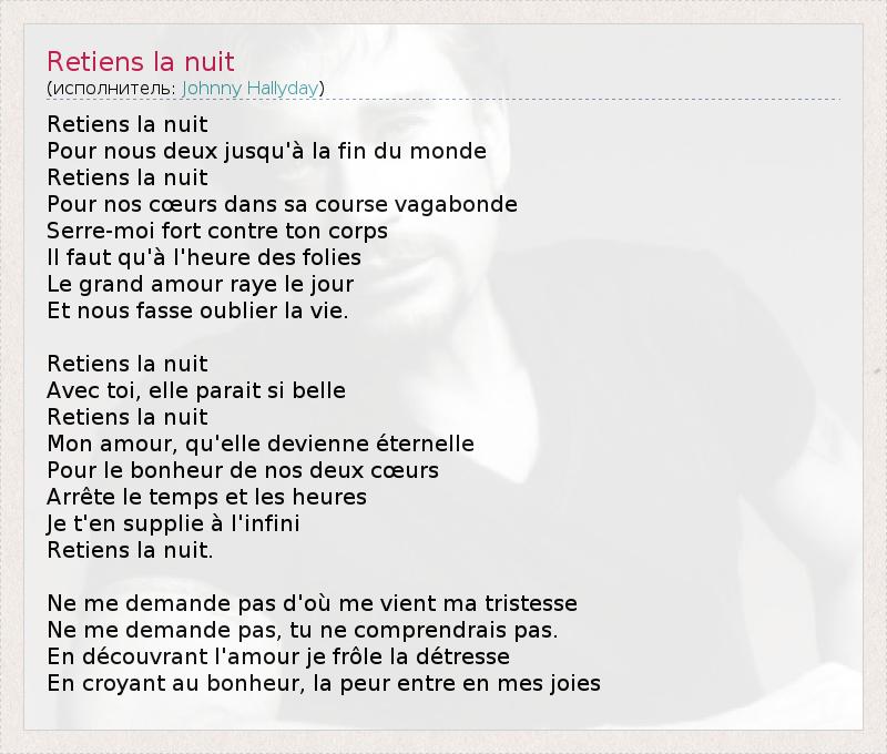Придержи ночь Для нас двоих до конца мира. Придержи ночь Для наших сердец в ее скитальческом пути. Прижми меня крепко к себе. Нужно, чтобы в час безумствий Огромная любовь озарила лучами день И заставила нас позабыть жизнь. Придержи ночь, С тобой она кажется такой прекрасной. Придержи ночь, Любовь моя, пусть она* будет вечной. Ради счастья наших двух сердец Останови время и часы. Я беспрестанно молю тебя, Придержи ночь. Не спрашивай меня, откуда ко мне приходит грусть. Не спрашивай меня, ты все равно не поняла бы этого. Я касаюсь твоей тоски, открывая любовь, Веря в счастье, страх меж своих радостей. * ночь