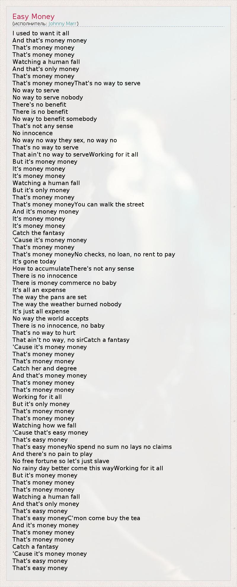 I used to want it all And that's money money That's money money That's money money Watching a human fall And that's only money That's money money That's money moneyThat's no way to serve No way to serve No way to serve nobody There's no benefit There is no benefit No way to benefit somebody That's not any sense No innocence No way no way they sex, no way no That's no way to serve That ain't no way to serveWorking for it all But it's money money It's money money It's money money Watching a human fall But it's only money That's money money That's money moneyYou can walk the street And it's money money It's money money It's money money Catch the fantasy 'Cause it's money money That's money money That's money moneyNo checks, no loan, no rent to pay It's gone today How to accumulateThere's not any sense There is no innocence There is money commerce no baby It's all an expense The way the pans are set The way the weather burned nobody It's just all expense No way the world accepts There is no innocence, no baby That's no way to hurt That ain't no way, no sirCatch a fantasy 'Cause it's money money That's money money That's money money Catch her and degree And that's money money That's money money That's money money Working for it all But it's only money That's money money That's money money Watching how we fall 'Cause that's easy money That's easy money That's easy moneyNo spend no sum no lays no claims And there's no pain to play No free fortune so let's just slave No rainy day better come this wayWorking for it all But it's money money That's money money That's money money Watching a human fall And that's only money That's easy money That's easy moneyC'mon come buy the tea And it's money money That's money money That's money money Catch a fantasy 'Cause it's money money That's easy money That's easy money
